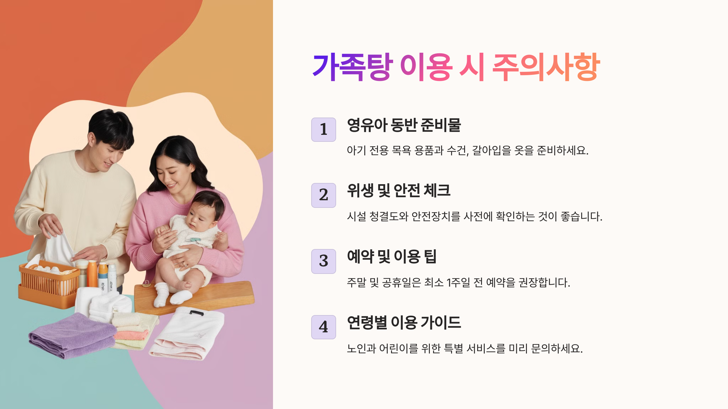 요즘 가족탕을 운영하는 목욕탕은 대부분 사전 예약제를 실시하고 있어요. 현장 방문도 가능하긴 하지만 인기 시간대는 순식간에 마감되기 때문에 온라인 예약이 필수랍니다.