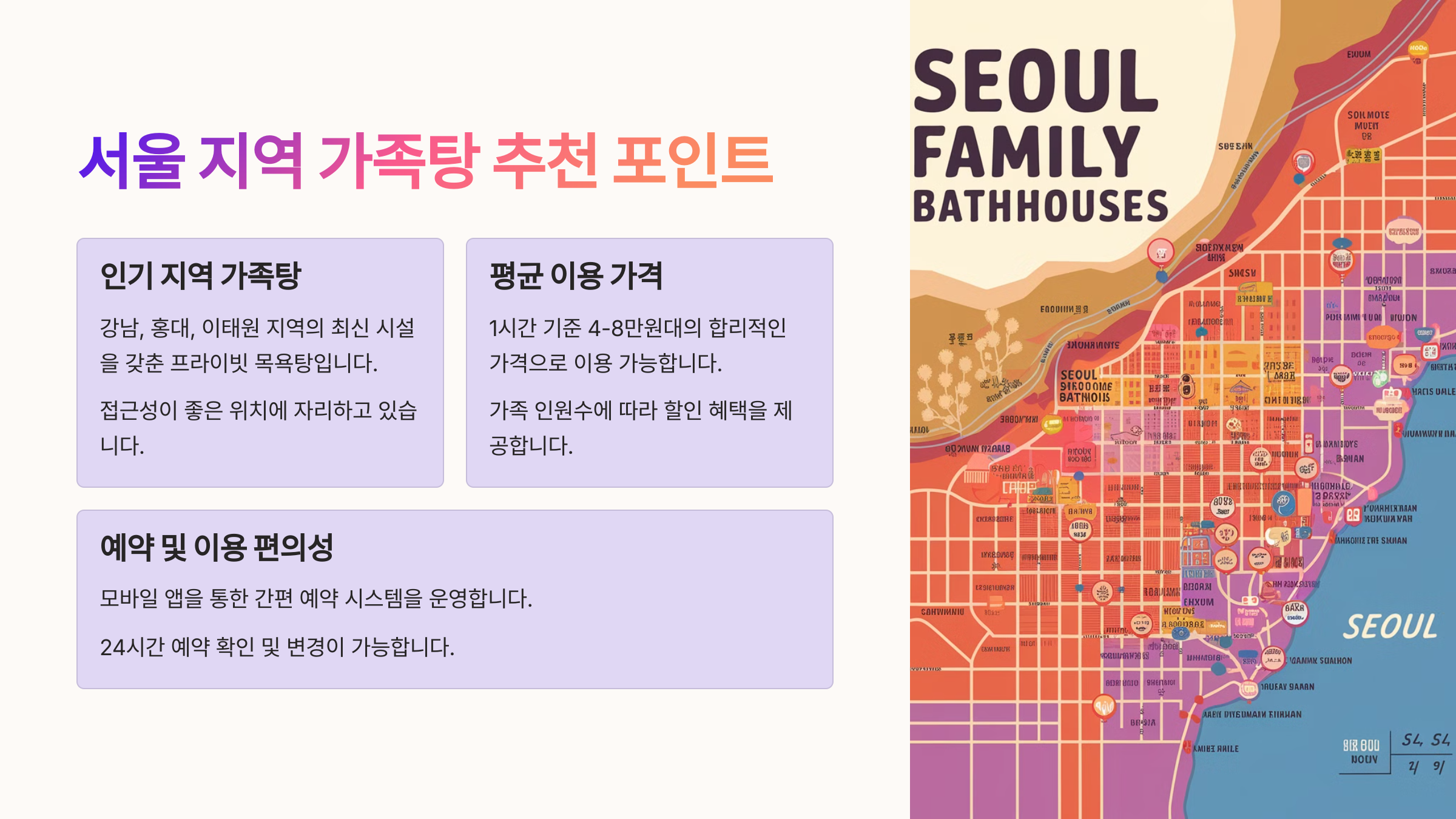 서울에는 '가족탕'이라는 이름을 걸고 운영하는 목욕탕이 꾸준히 늘고 있어요. 이런 곳들은 보통 2~6인 기준의 독립된 공간을 제공하고, 사전에 예약을 통해 시간 단위로 사용할 수 있어요.