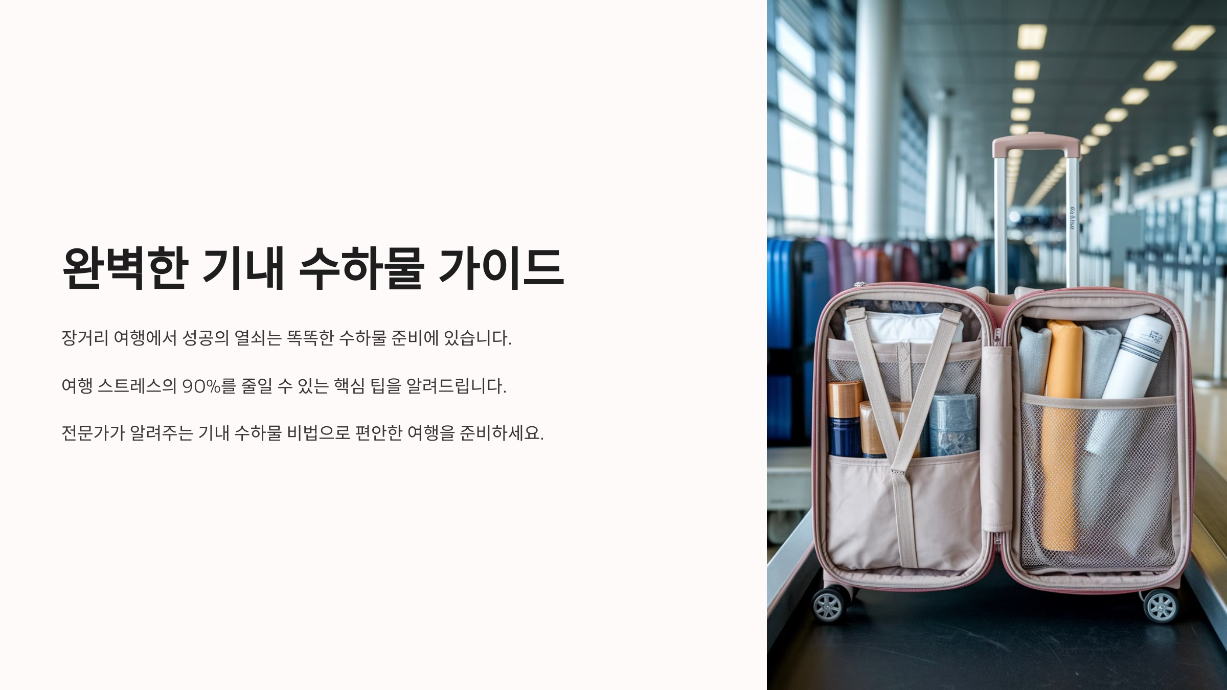 하지만 뭘 넣어야 할지, 뭘 빼야 할지 헷갈리는 분들이 많죠? 이 글에서는 기내 수하물에 꼭 챙겨야 할 필수 아이템부터 수납 노하우, 검사에서 걸리는 위험 물품까지 낱낱이 알려드릴게요.