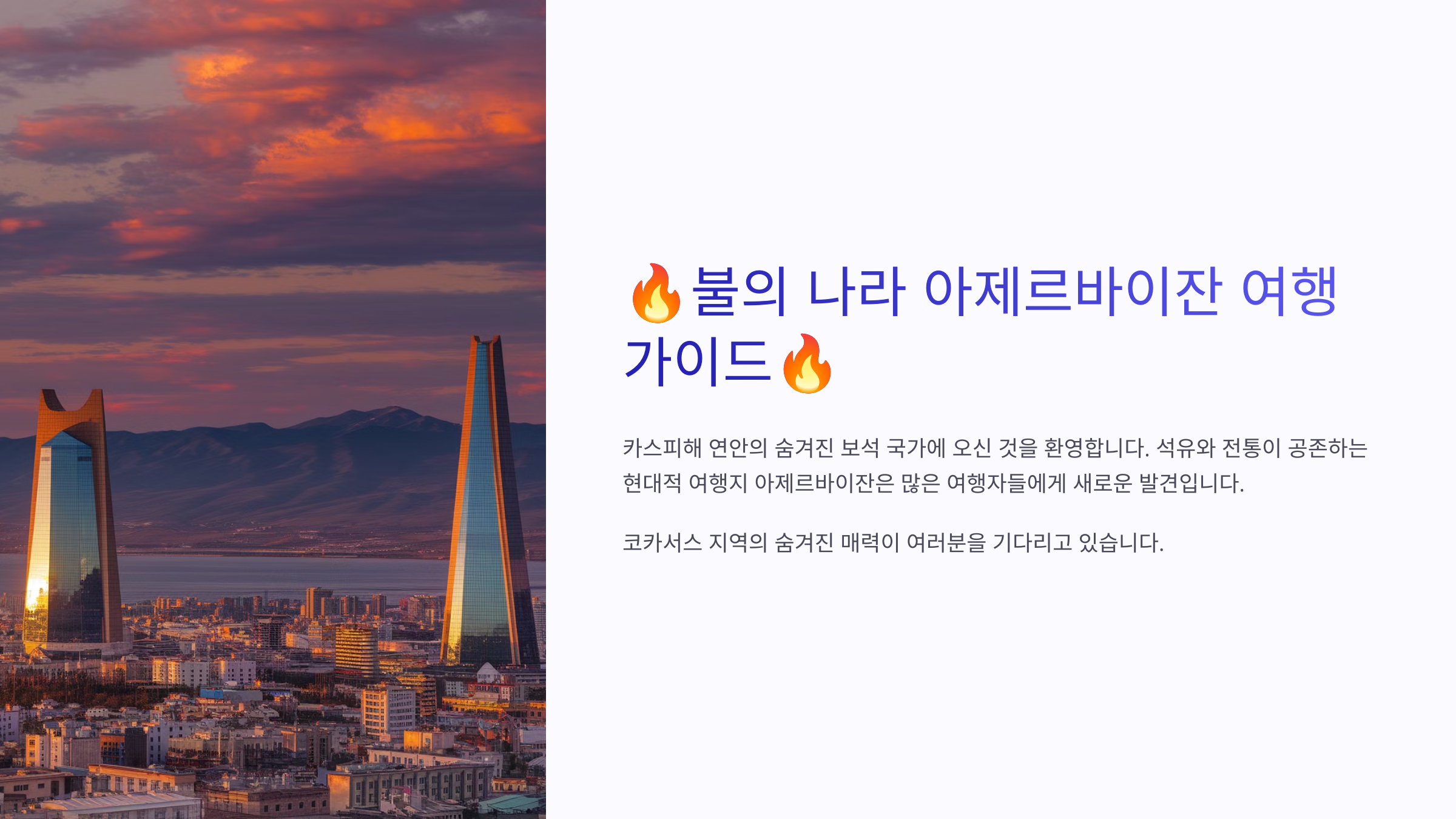 아제르바이잔은 유럽과 아시아의 경계에 위치한 독특한 매력을 가진 나라예요. 풍부한 천연자원, 오래된 문화유산, 현대적인 도시가 공존하는 이곳은 요즘 여행자들 사이에서 핫한 여행지로 떠오르고 있어요. 특히 '불의 나라'라는 별명답게 자연적으로 타오르는 불과 관련된 명소들이 많아서 독특한 여행 경험을 선사한답니다.