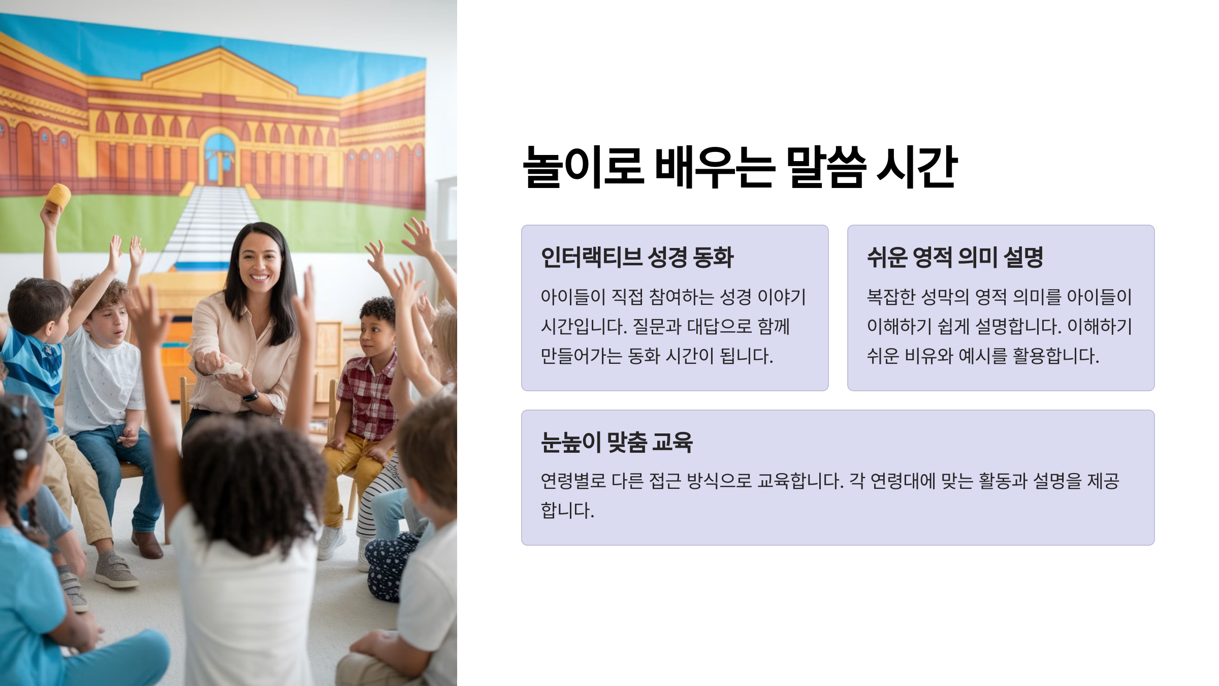 이런 접근 방식은 교회학교, 유치부, 초등부 연령 모두에게 최적화되어 있고, 반복을 통해 말씀의 핵심을 자연스럽게 습득할 수 있도록 도와줘요. 📖