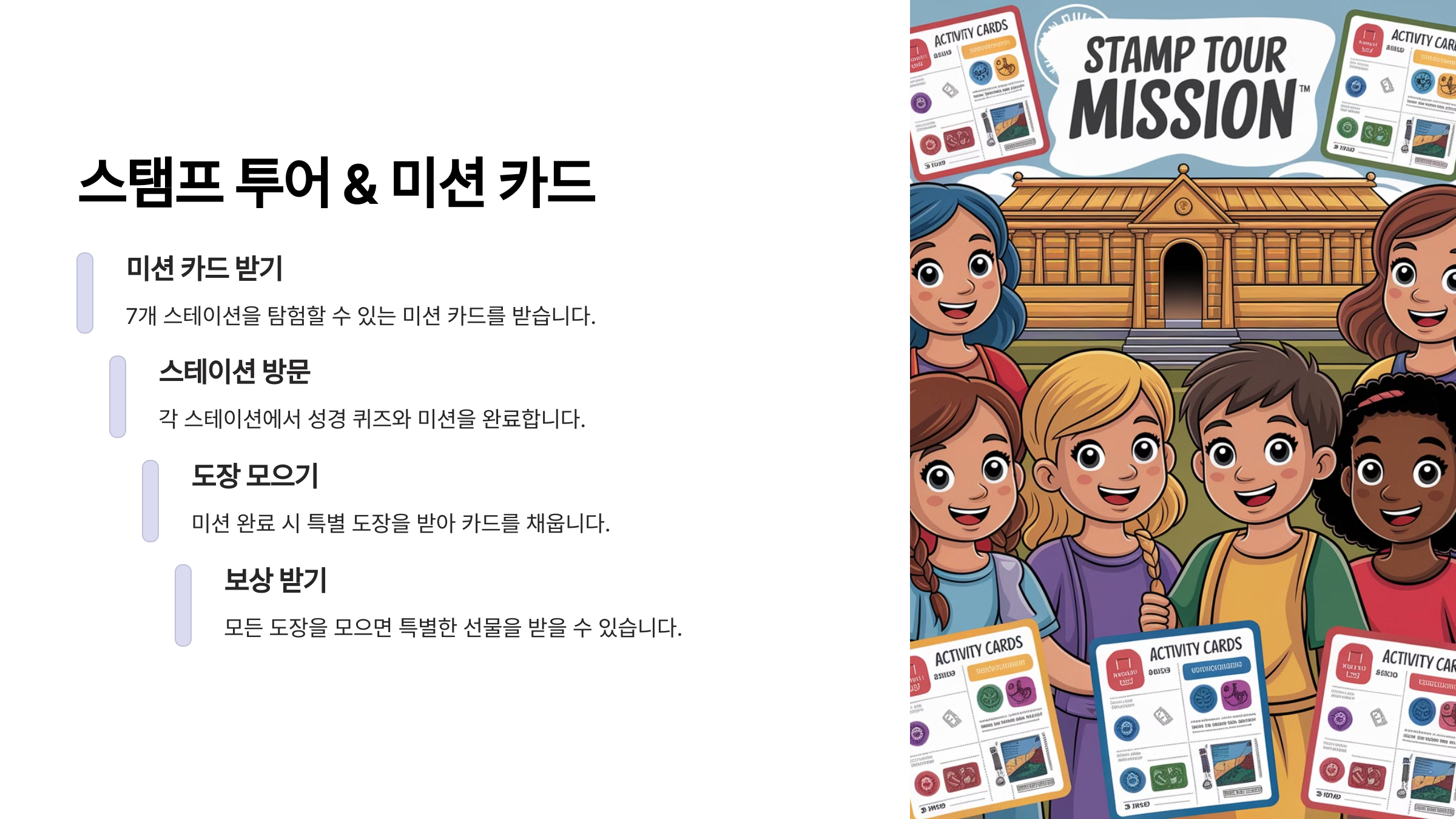 아이들이 성막 체험을 더욱 재미있고 집중력 있게 즐길 수 있도록, 센터에서는 ‘스탬프 투어 & 미션 카드’를 운영하고 있어요! 마치 보물찾기처럼 곳곳에 숨어 있는 스탬프를 모으고, 주어진 미션을 해결하면 특별한 보상이 기다리고 있어요. 🎯