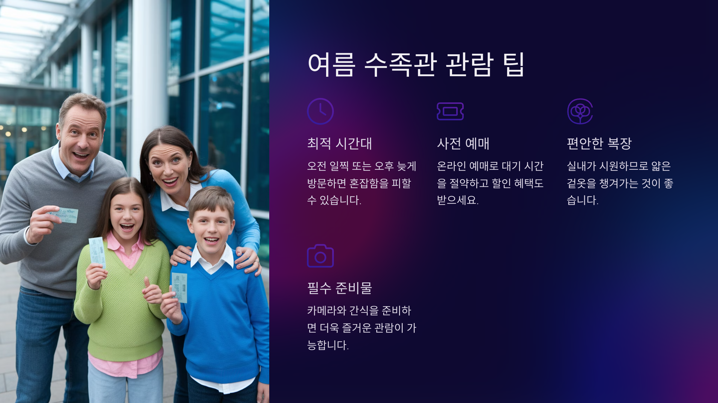이제 마지막으로 여름 수족관 관람 시 알아두면 좋은 꿀팁들을 정리해드릴게요. 알면 더 시원하고 똑똑한 관람이 될 거예요!💡