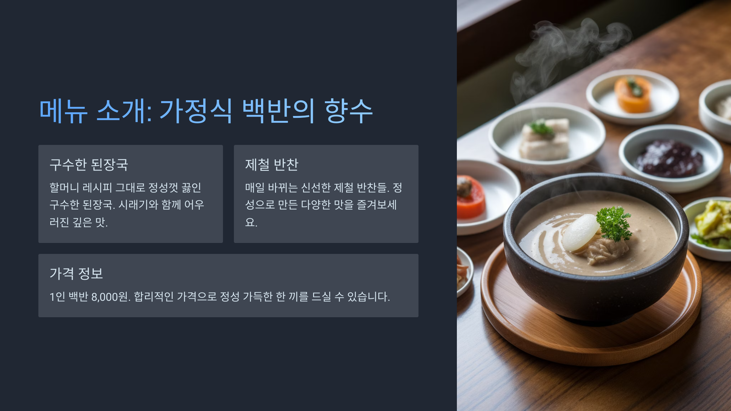 다음 섹션에서는 이런 손맛이 녹아든 ‘가정식 백반 메뉴 구성’에 대해 하나하나 짚어볼게요. 기대해주세요! 🍱