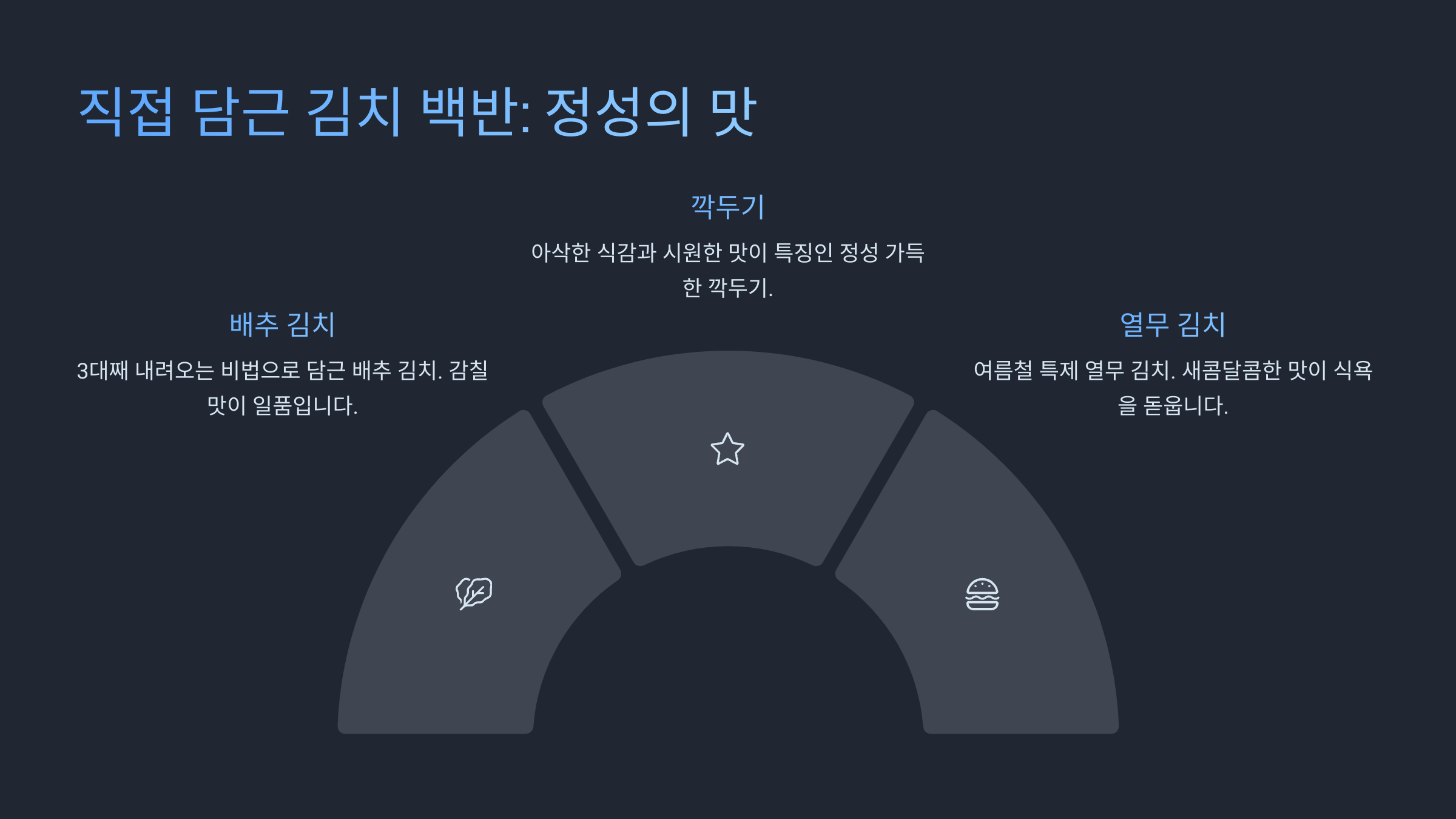 특히 갓김치, 파김치, 열무김치 등 다양한 김치가 계절마다 달라지는데요, 그 맛은 도시 김치와는 확연히 다르답니다. 마늘, 생강, 멸치젓, 새우젓을 적절히 섞어 발효의 깊이를 조절하는 게 포인트예요.