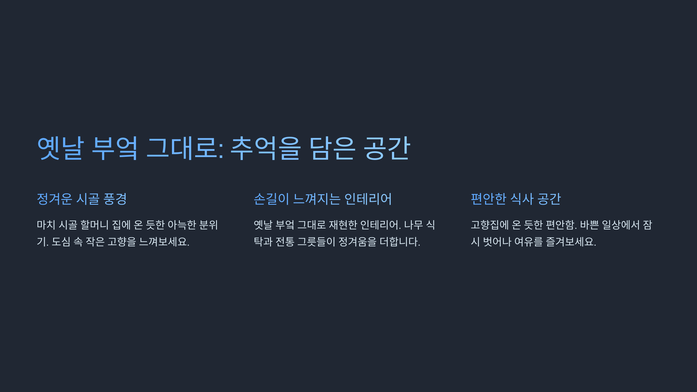 이제 다음 섹션에선 시골 백반집만의 분위기와 감성, 그 정겨운 공간 속으로 들어가 볼게요! 🧑🌾