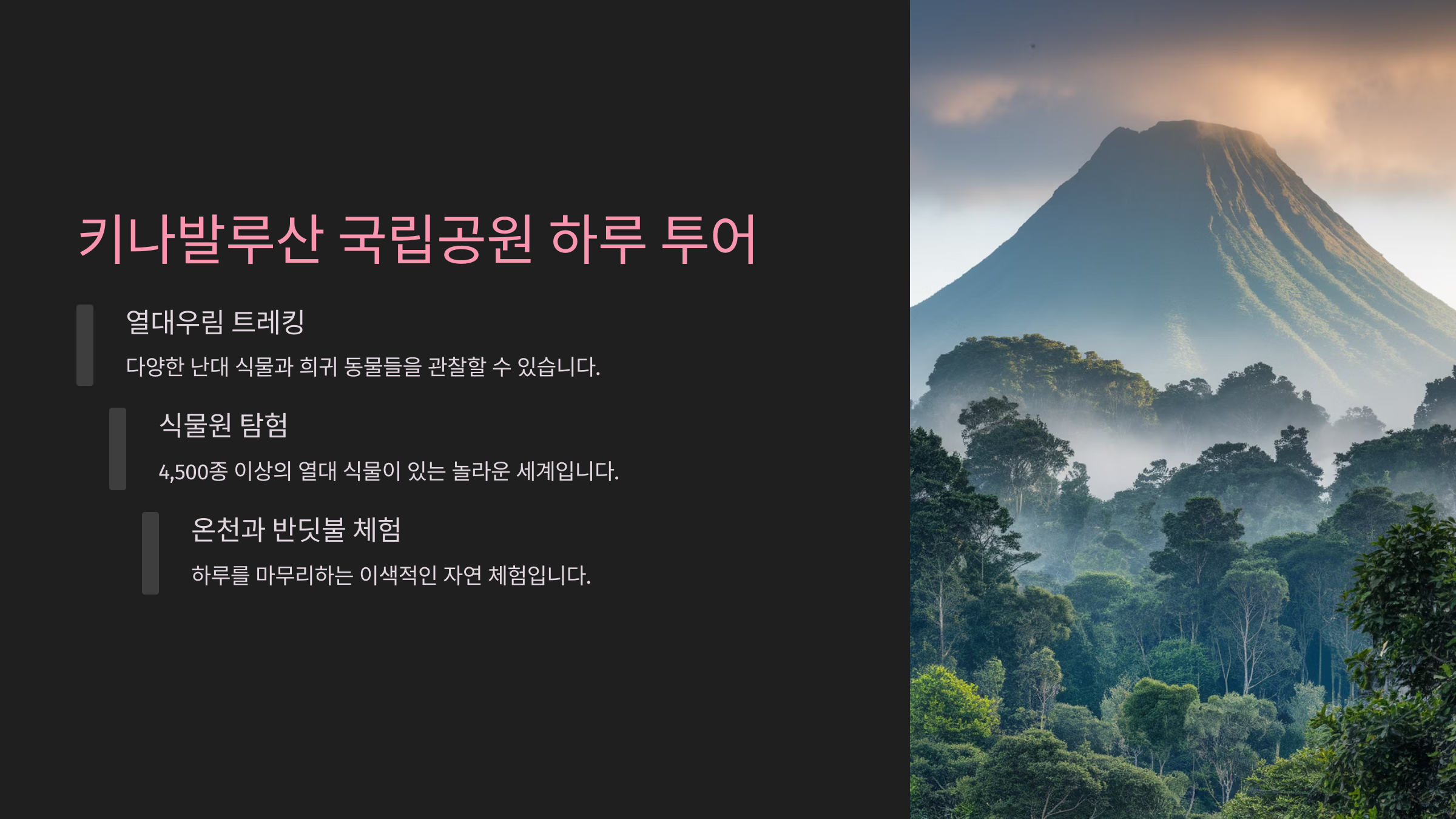 코타키나발루에서 단 하루만 자연 속에 푹 빠져보고 싶다면, 키나발루산 국립공원 투어가 제격이에요. 이곳은 말레이시아에서 가장 높은 산인 키나발루산(해발 4,095m)을 중심으로 조성된 세계자연유산이에요. 유네스코에도 등재된 만큼 자연의 경이로움을 직접 느낄 수 있는 특별한 장소예요.
