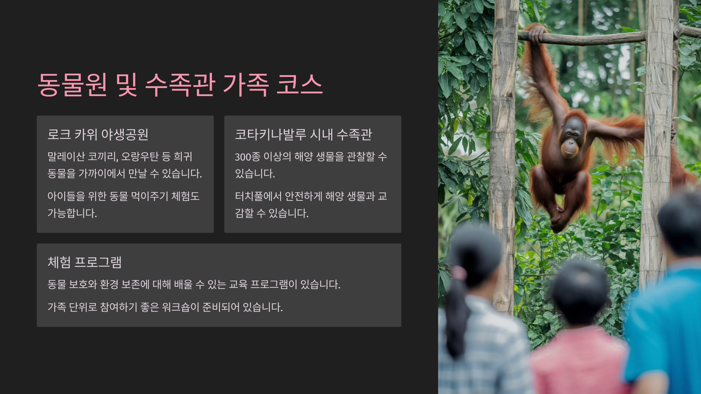 코타키나발루는 바다와 산만 있는 게 아니에요. 아이들과 함께라면 꼭 추천하고 싶은 동물 체험 코스도 있답니다. 특히 '로카위 야생동물공원(Lok Kawi Wildlife Park)'과 '코타키나발루 시립 수족관'은 아이들이 좋아할 요소가 가득해요.