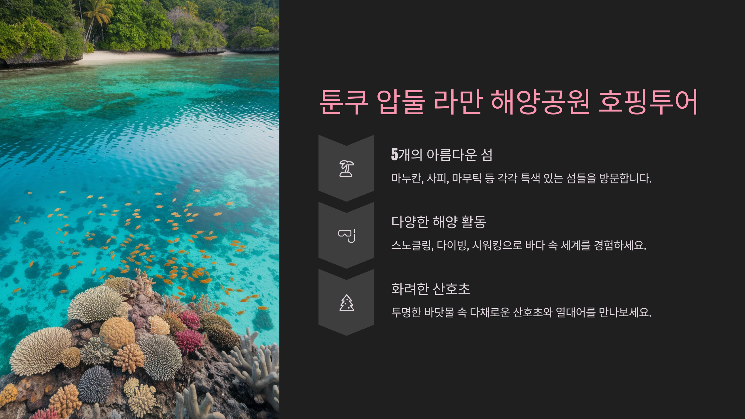 코타키나발루에서 가장 인기 있는 액티비티 중 하나는 바로 '툰쿠 압둘 라만 해양공원 호핑투어'예요. 총 5개의 섬으로 이루어진 이 해양공원은 깨끗한 바다와 산호초, 다양한 해양 생물로 가득하답니다. 각 섬마다 개성이 뚜렷해서 하루 만에 여러 섬을 둘러보는 호핑투어가 인기를 끌고 있어요.