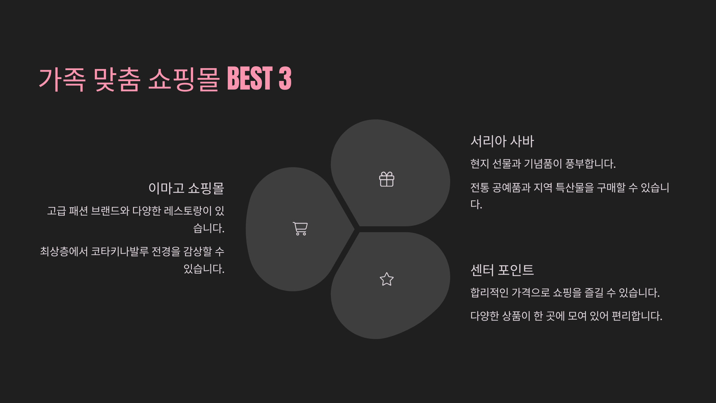 | 센터포인트 | 로컬 감성, 저렴한 쇼핑 가능 |