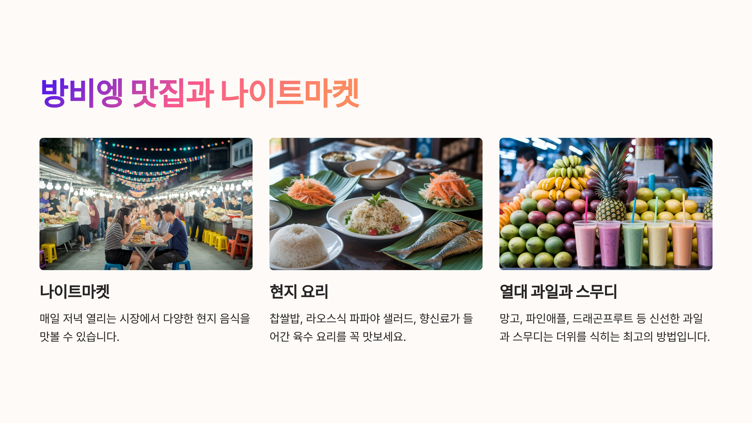 자연 속 모험을 마쳤다면 이제는 맛있는 한 끼로 여행을 마무리해봐야죠! 방비엥에는 저렴하면서도 맛있는 현지 음식점부터 트렌디한 레스토랑, 그리고 활기찬 나이트마켓까지 다양하게 즐길 수 있어요 😋