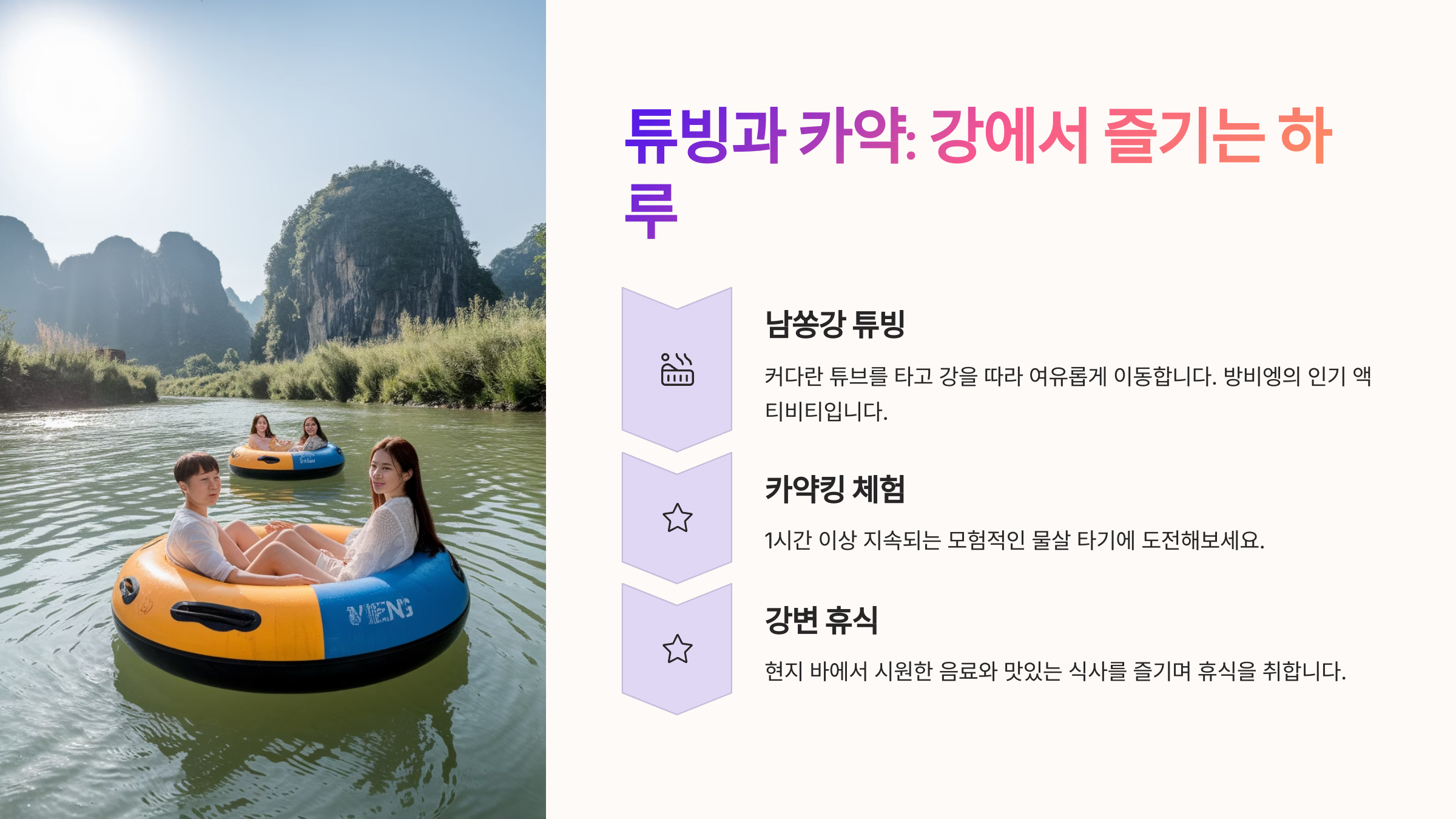 방비엥 하면 가장 먼저 떠오르는 건 단연 튜빙이에요! 남송강 위에서 튜브를 타고 천천히 떠내려가며 자연을 즐기는 이 체험은 방비엥만의 대표 액티비티예요.