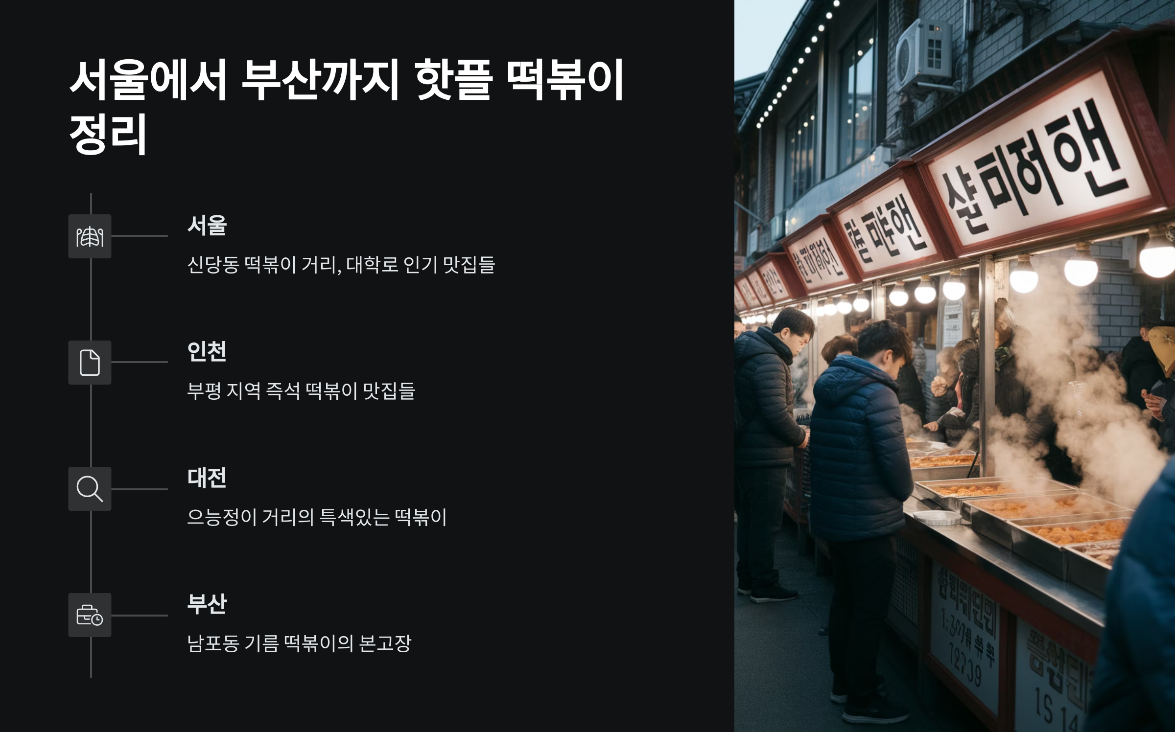 대한민국에서 떡볶이는 단순한 간식이 아니라, 진짜 지역의 정체성과도 연결돼 있는 음식이에요. 서울식 떡볶이는 간장 베이스에서 시작해 고추장 양념으로 진화했고, 부산은 어묵과 국물이 넉넉한 '밀떡' 국물 떡볶이가 대세예요.