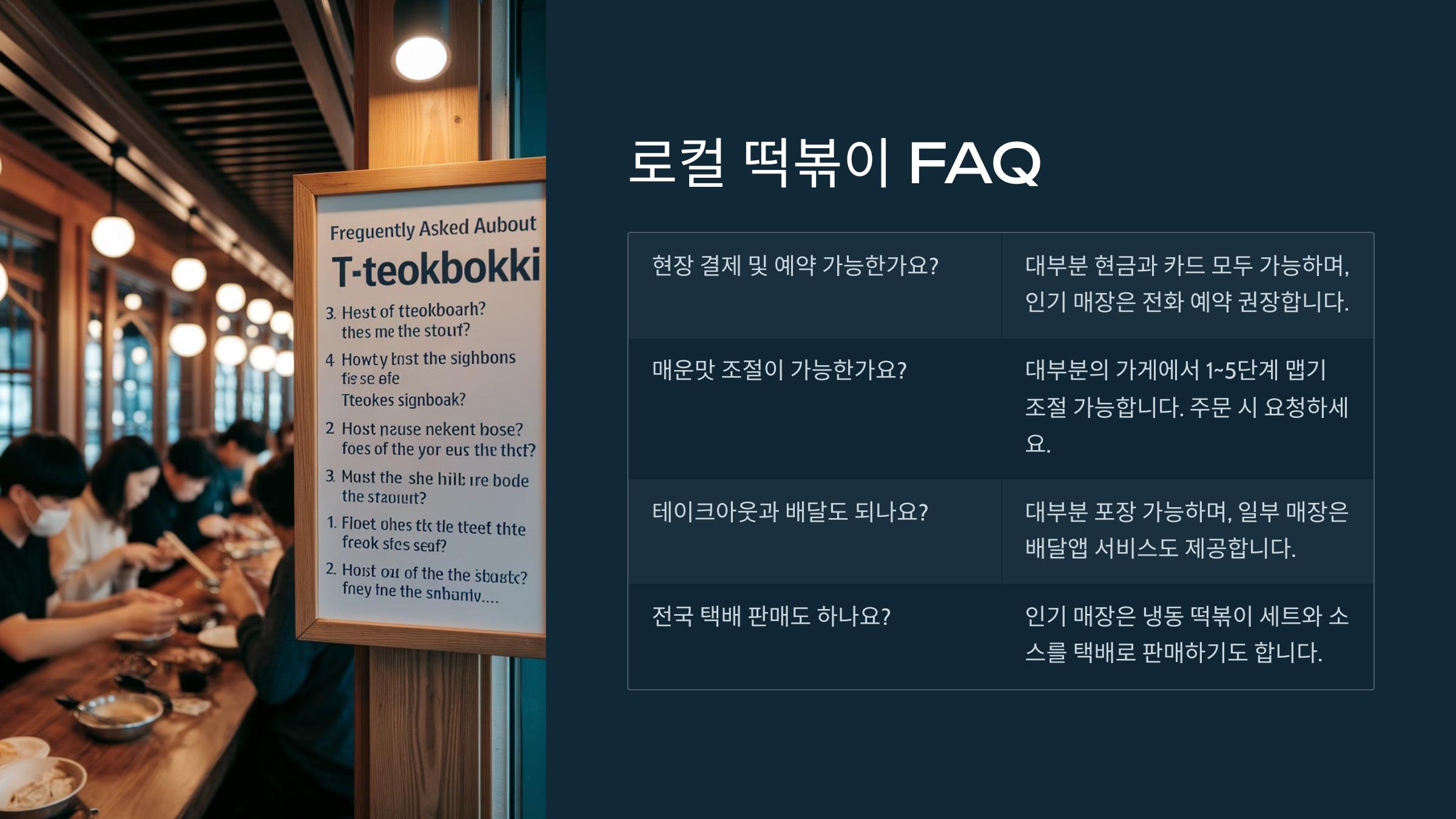 A1. 로컬 떡볶이는 직접 만든 떡과 수제 소스, 그리고 사장님의 손맛이 녹아 있어요. 한결같은 공장식 맛보단 사람 냄새나는 정겨운 맛이 특징이에요.