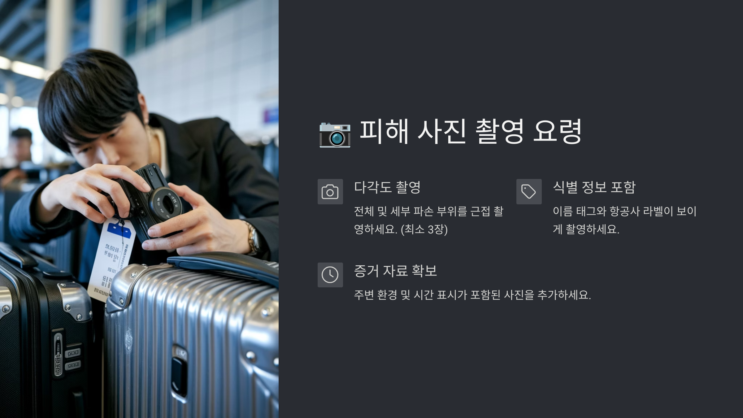 또한 수하물 태그와 항공권 정보도 함께 찍어두는 게 좋아요. 나중에 항공사에 자료를 제출할 때, 이 두 정보가 빠지면 접수 자체가 지연될 수 있거든요.