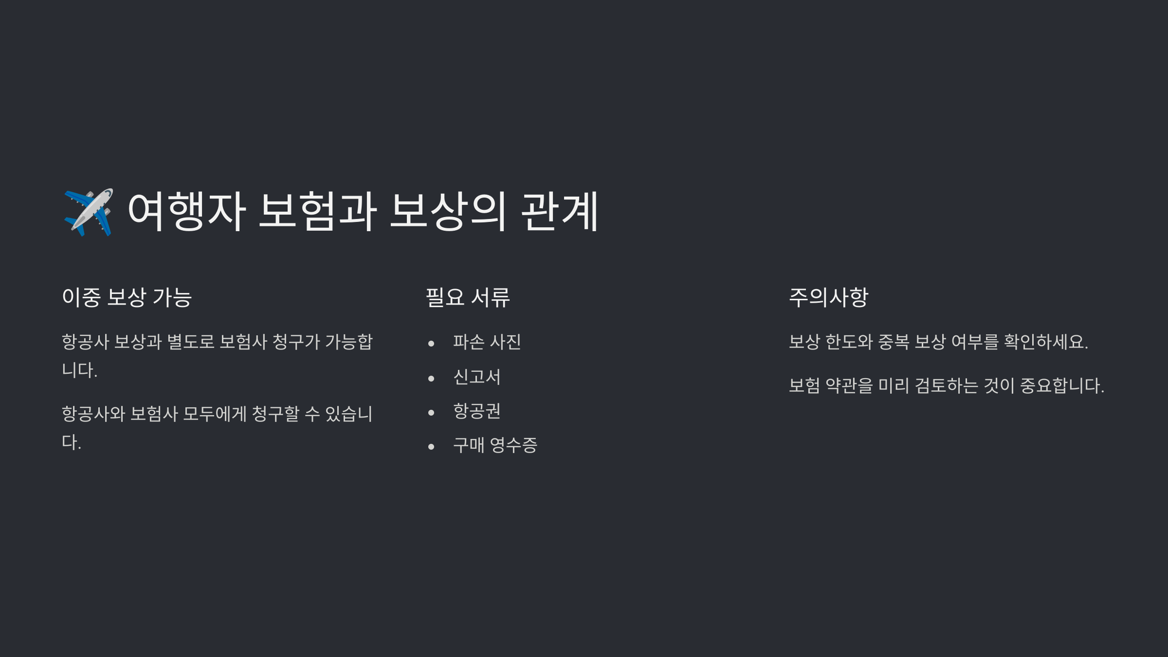 혹시 여행자 보험에 가입했다면? 항공사 보상과는 별도로 **추가 보상**을 받을 수 있는 좋은 기회가 돼요.