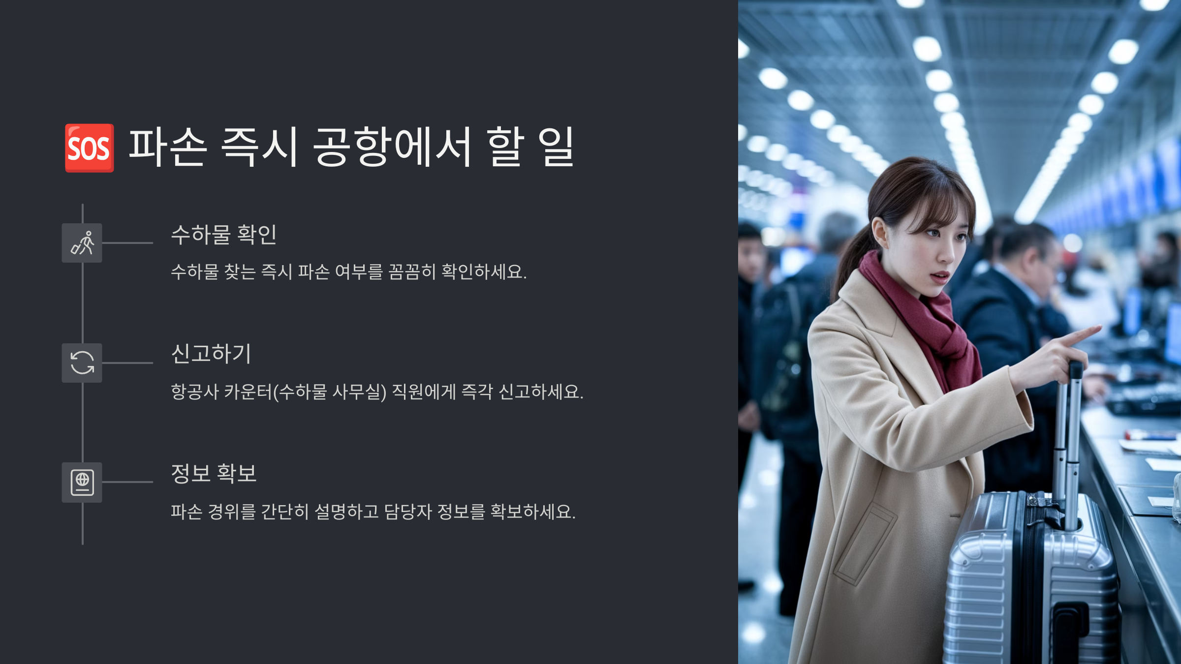 나도 예전에 인천공항에서 수하물 바퀴가 반쯤 빠져 있었던 적이 있었는데, 초반에 신고를 놓쳐서 결국 보상을 못 받았어요. 그 경험을 바탕으로 확실한 가이드를 준비했어요!