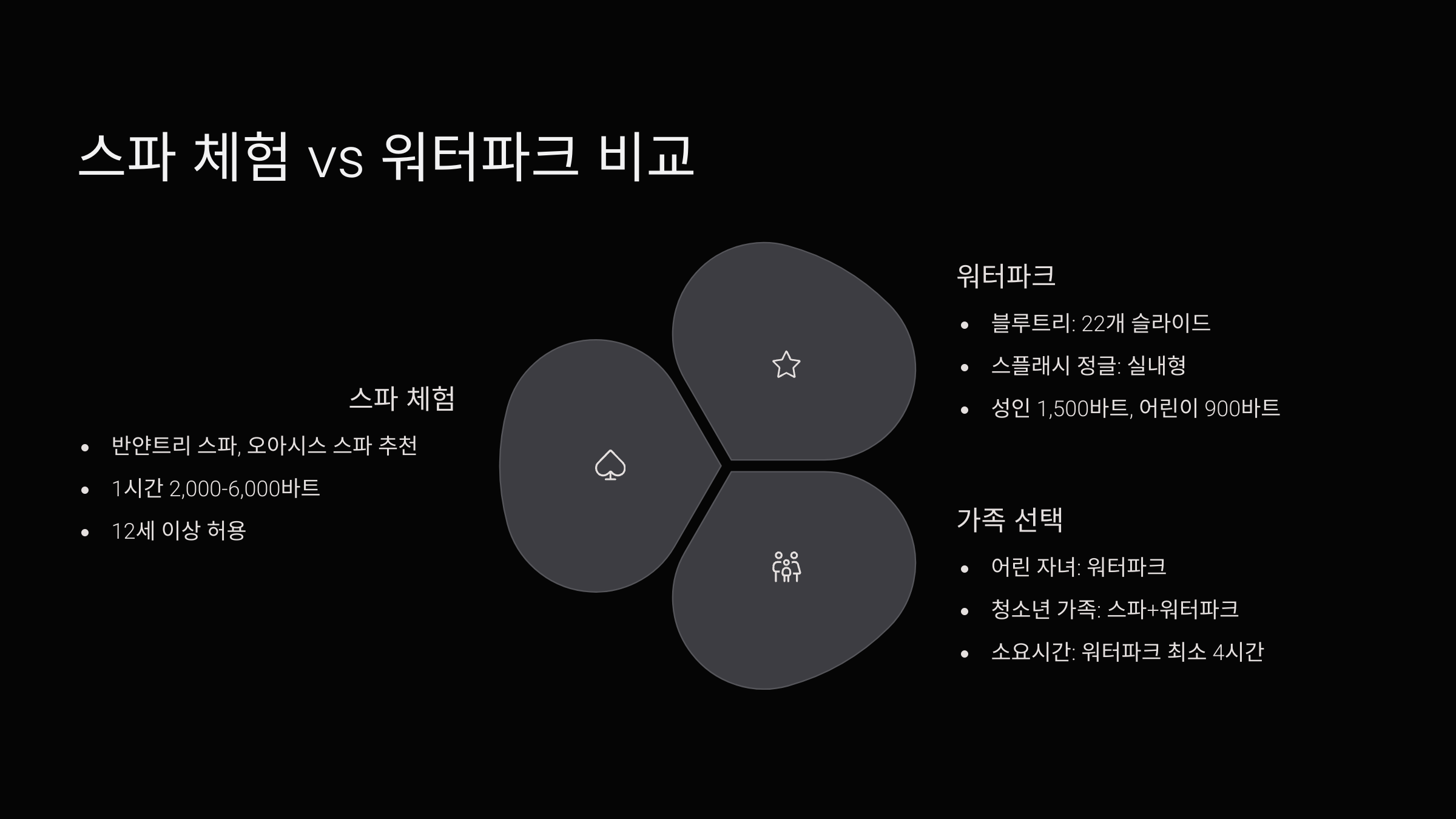 시간이 한정돼 있다면 가족 구성원 우선순위에 따라 **“오늘은 스파데이 or 워터데이”**로 정하고 하루를 통째로 활용하는 게 더 효율적이에요. 아래 비교표 참고해서 골라보세요!