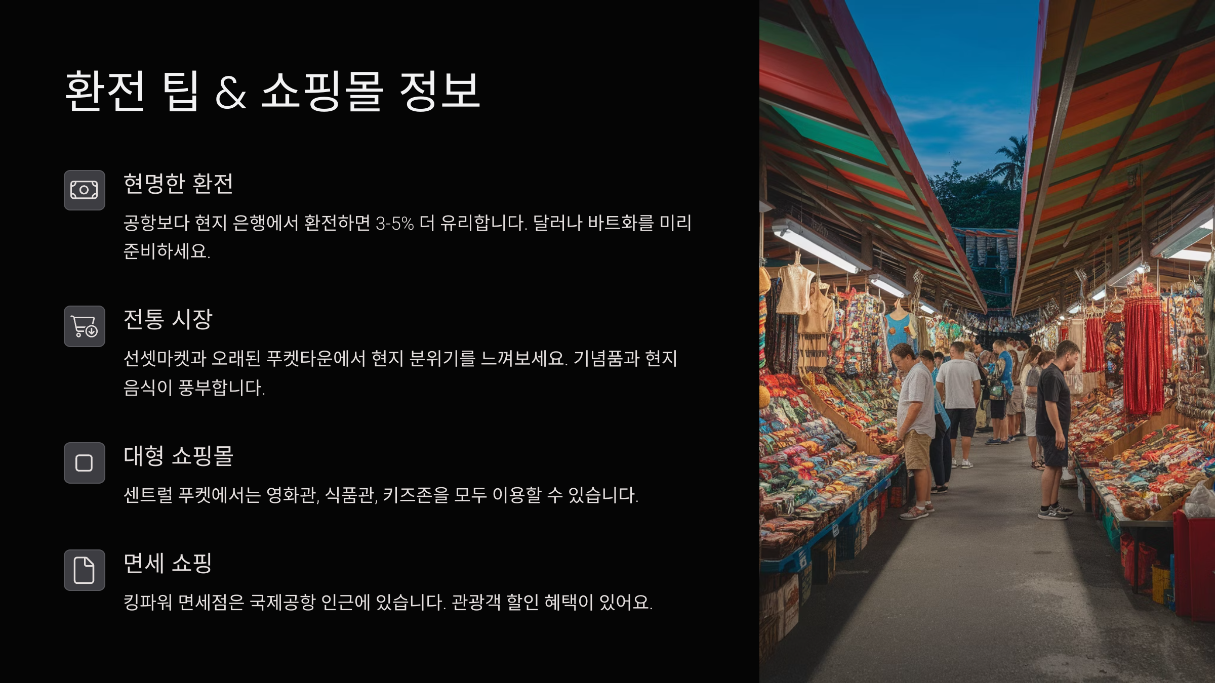 태국 푸껫 여행에서 빠질 수 없는 두 가지는 바로 **환전과 쇼핑**이에요. 환전은 여행 경비를 아끼는 데 직결되고, 쇼핑은 여행의 재미를 책임지니까요. 🎁