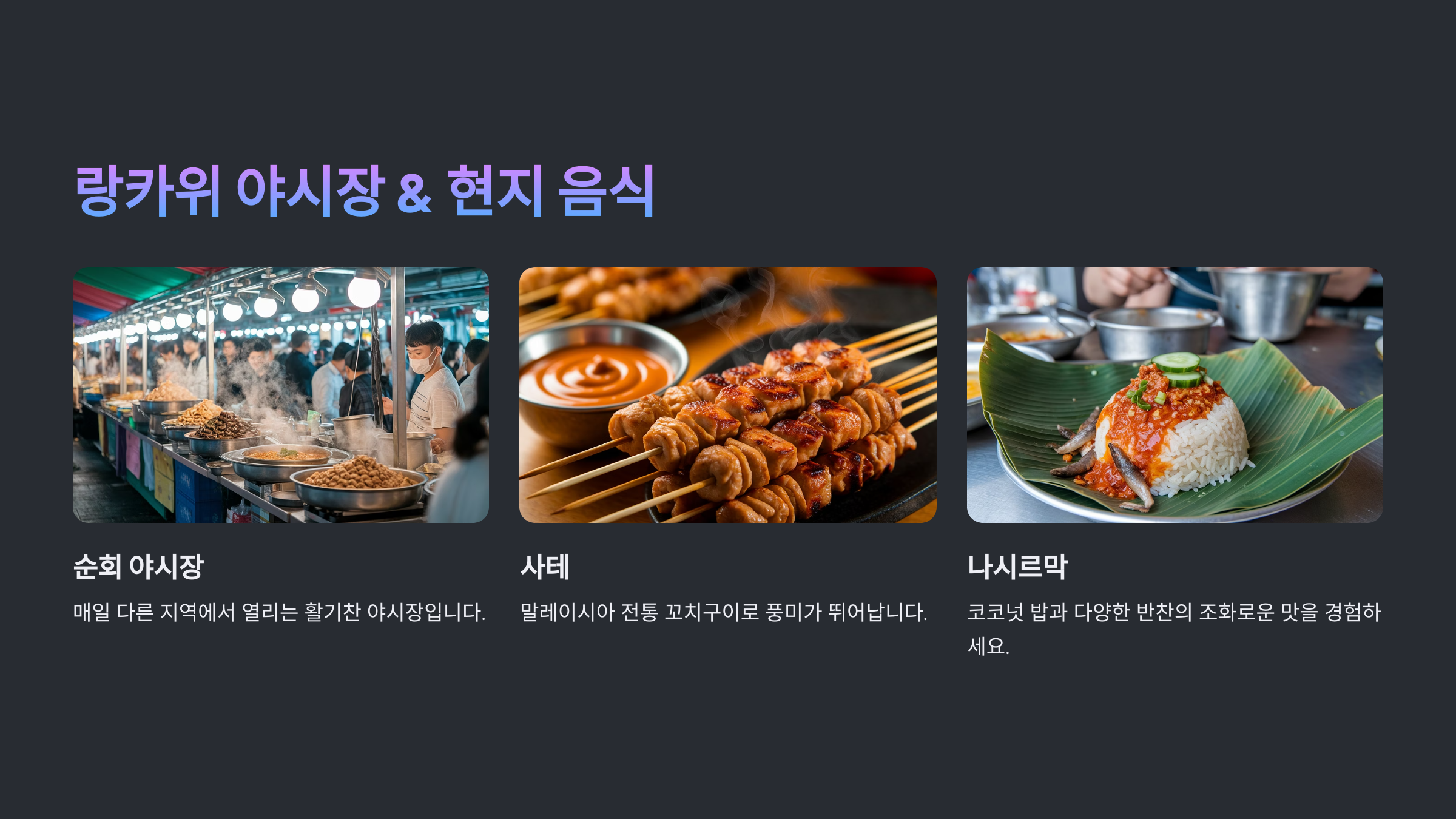 랑카위의 야시장은 여행자에게 진정한 말레이 문화를 체험하게 해주는 공간이에요. 매일 다른 지역에서 열리는 야시장은 각기 다른 분위기와 특색 있는 먹거리를 자랑해요. 관광객은 물론 현지인들에게도 인기 만점이죠!
