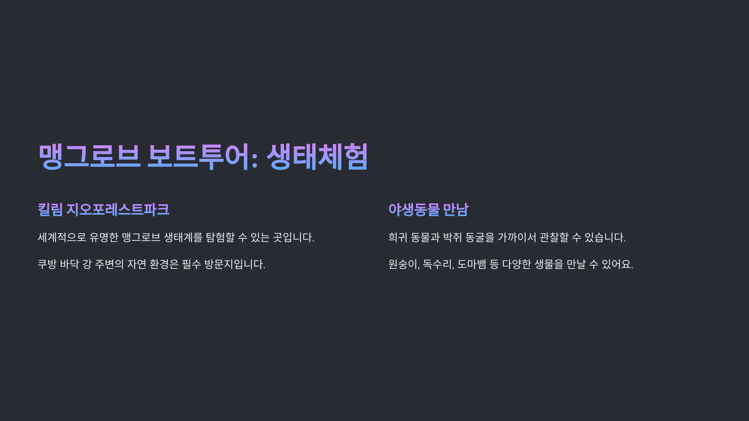맹그로브 투어는 보통 2시간~4시간 코스로 나뉘고, 코스에 따라 독수리 먹이주기, 박쥐 동굴 탐험, 악어 동굴, 어류농장 방문까지 포함돼요. 특히 아이들과 함께라면 교육적인 체험도 가능해서 가족여행에 딱이에요.