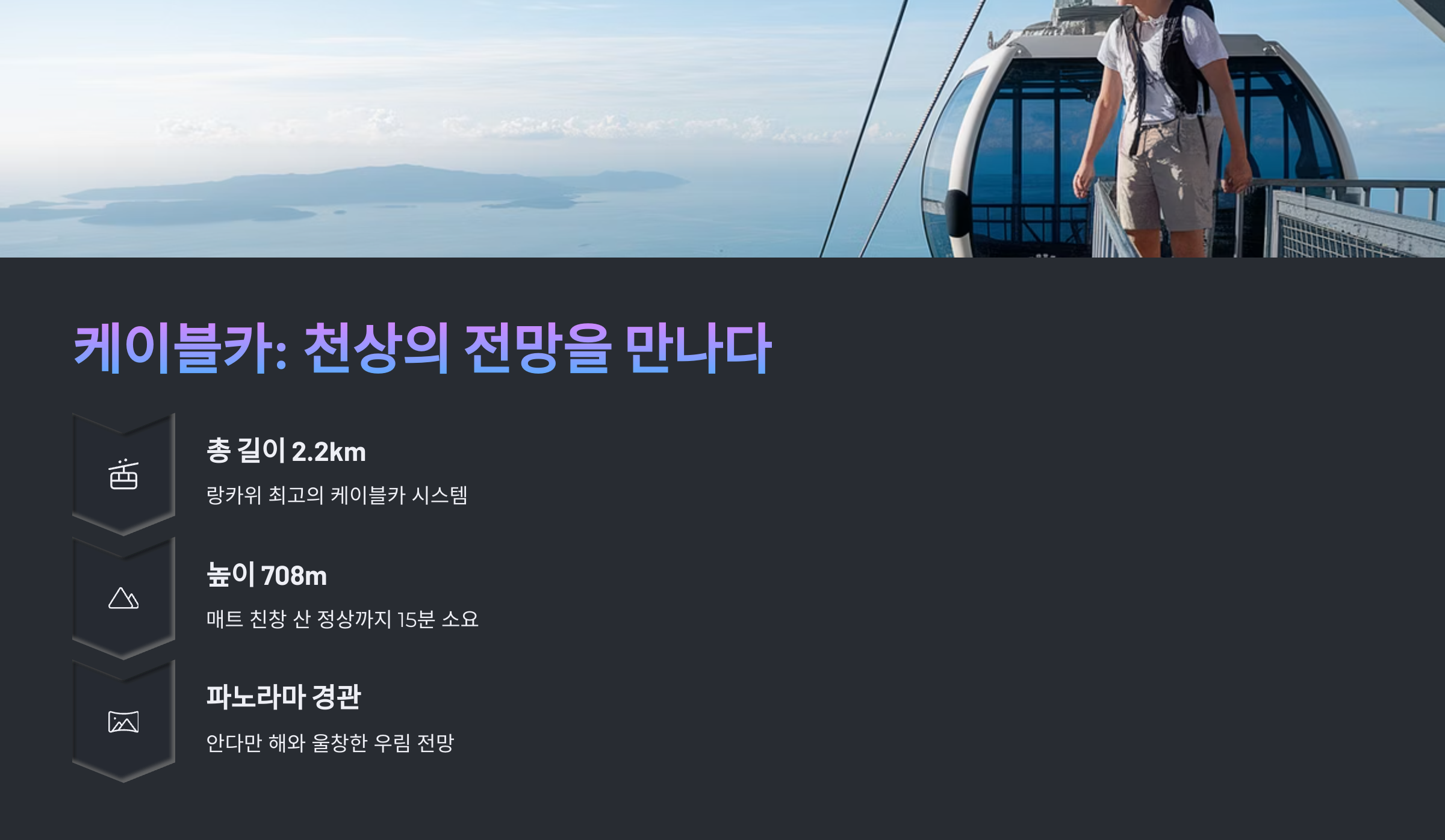 랑카위에서 가장 유명한 액티비티 중 하나는 바로 마칭짱 산(Mount Mat Cincang)을 오르는 케이블카예요. 이 케이블카는 동남아시아에서도 가장 가파른 경사도를 자랑하는데, 정상까지 올라가는 내내 숨 막히는 절경이 펼쳐져요.