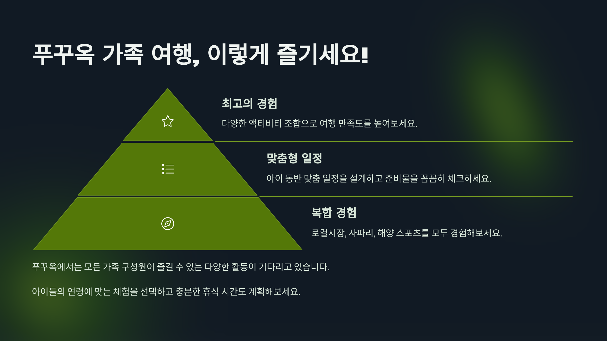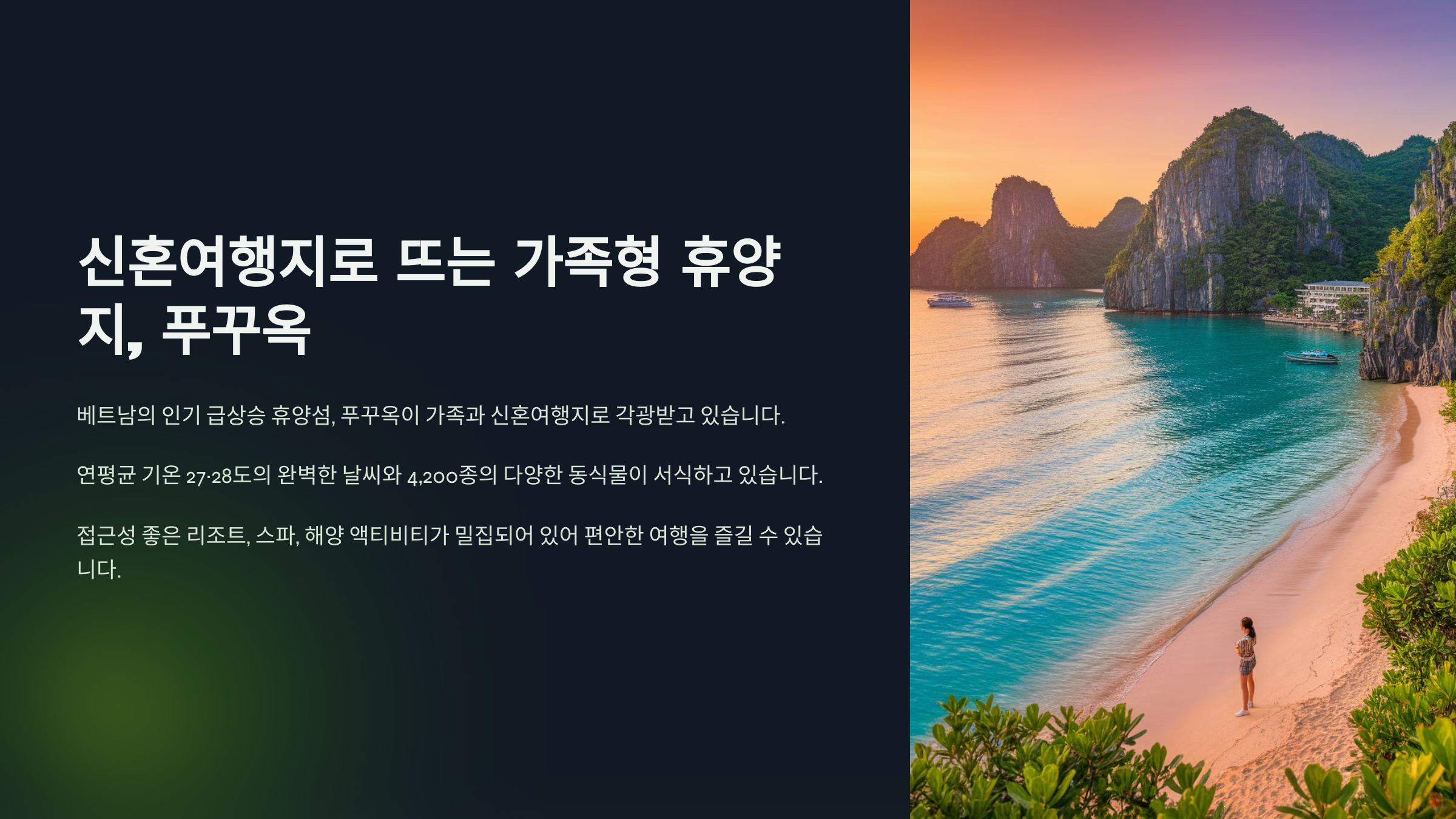 푸꾸옥은 요즘 가장 핫한 가족형 신혼여행지로 떠오르고 있어요. 베트남의 남쪽 끝에 위치한 이 섬은 푸른 바다와 다양한 체험, 합리적인 비용 덕분에 신혼부부부터 아이를 동반한 가족 여행객까지 모두에게 인기가 높아졌죠.