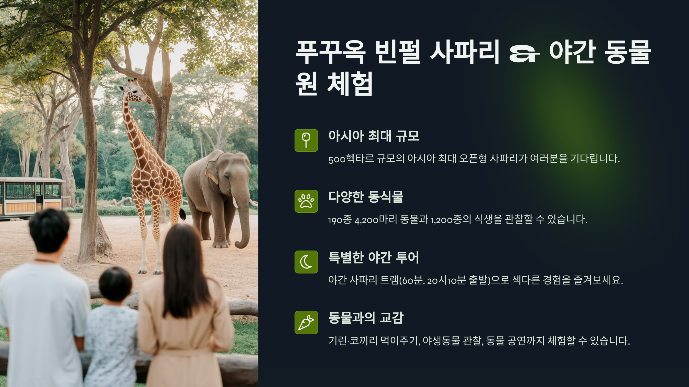 푸꾸옥 빈펄 사파리는 동남아 최대 규모의 사파리로, 아이와 함께 여행하는 가족에게 최고의 인기 코스예요. 약 150종 이상의 동물을 사육하고 있으며, 일반 동물원과 달리 사파리 버스를 타고 이동하며 동물들을 가까이에서 관찰할 수 있어요.