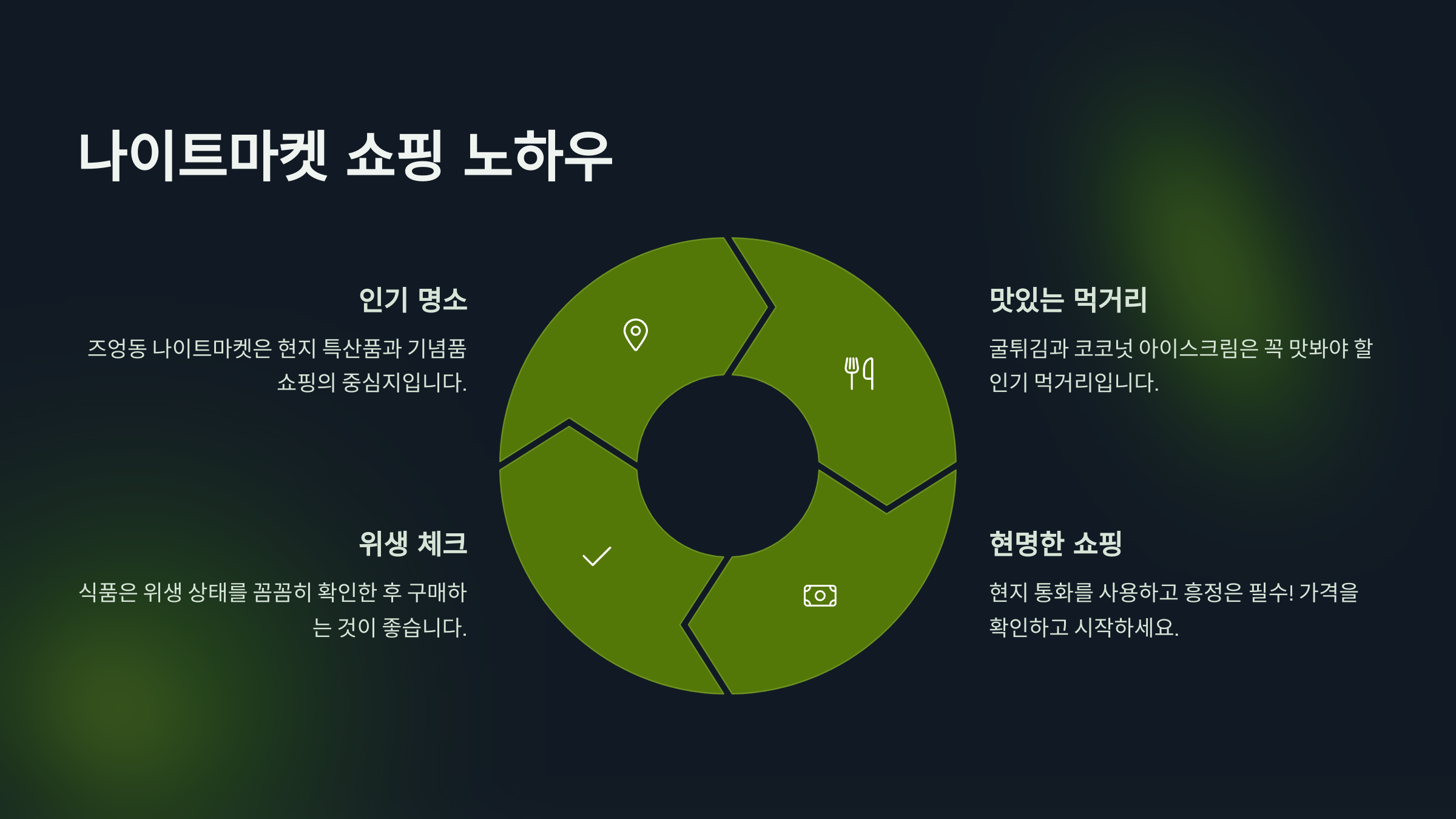 푸꾸옥의 밤을 가장 현지답게 즐길 수 있는 방법, 바로 나이트마켓 방문이에요. 특히 '즈엉동 나이트마켓'은 먹거리, 쇼핑, 구경거리 삼박자를 모두 갖춘 푸꾸옥 여행의 필수 코스죠. 저녁 6시부터 활기를 띠기 시작해요.
