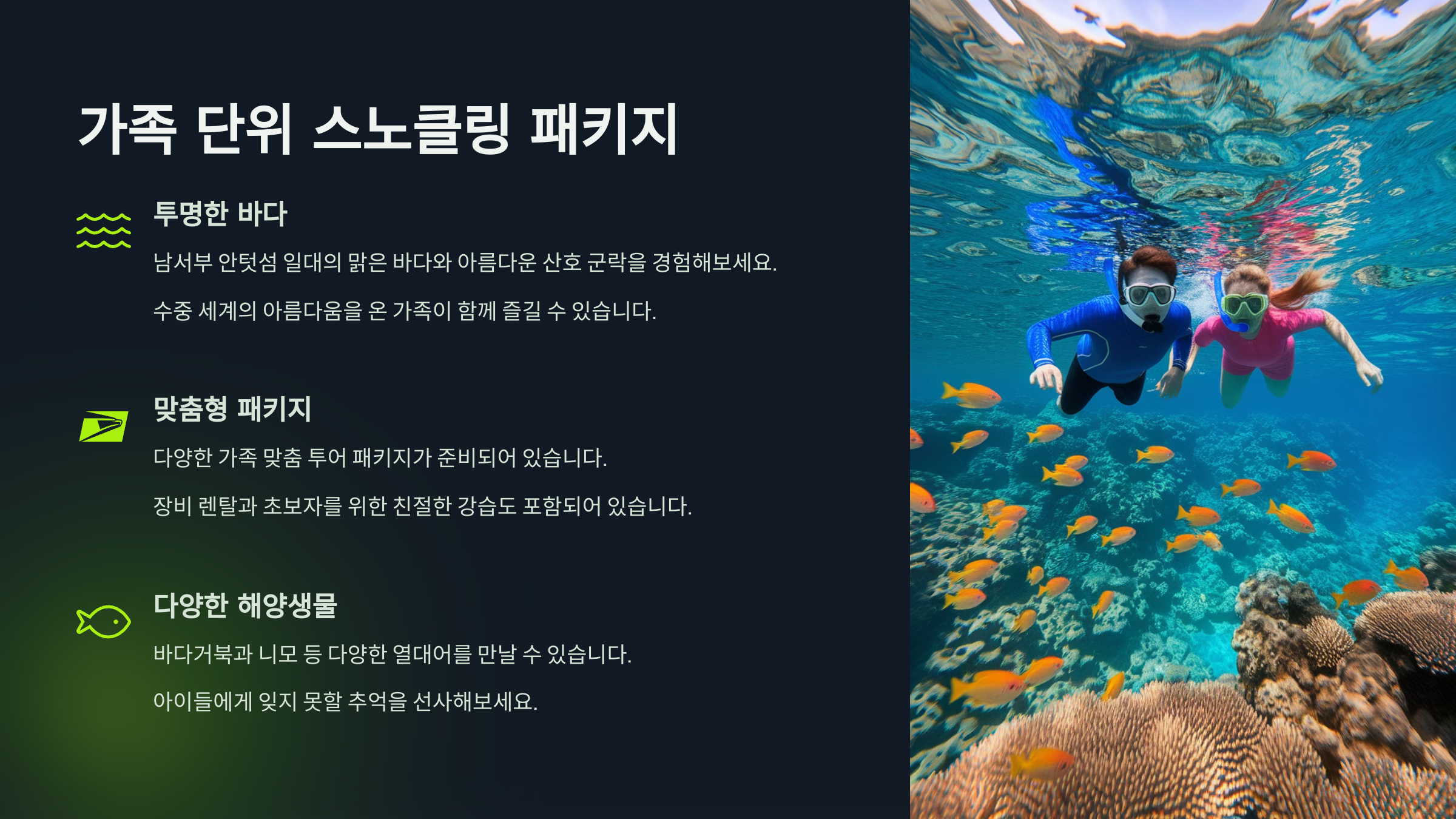 스노클링 투어는 보통 오전 반일 또는 하루 종일 진행돼요. 일부 패키지에는 점심식사나 BBQ, 해변 자유시간도 포함되어 있어서 하루 종일 놀거리 걱정 없어요. 특히 가족 단위로는 그룹 투어보다 프라이빗 투어를 추천해요.