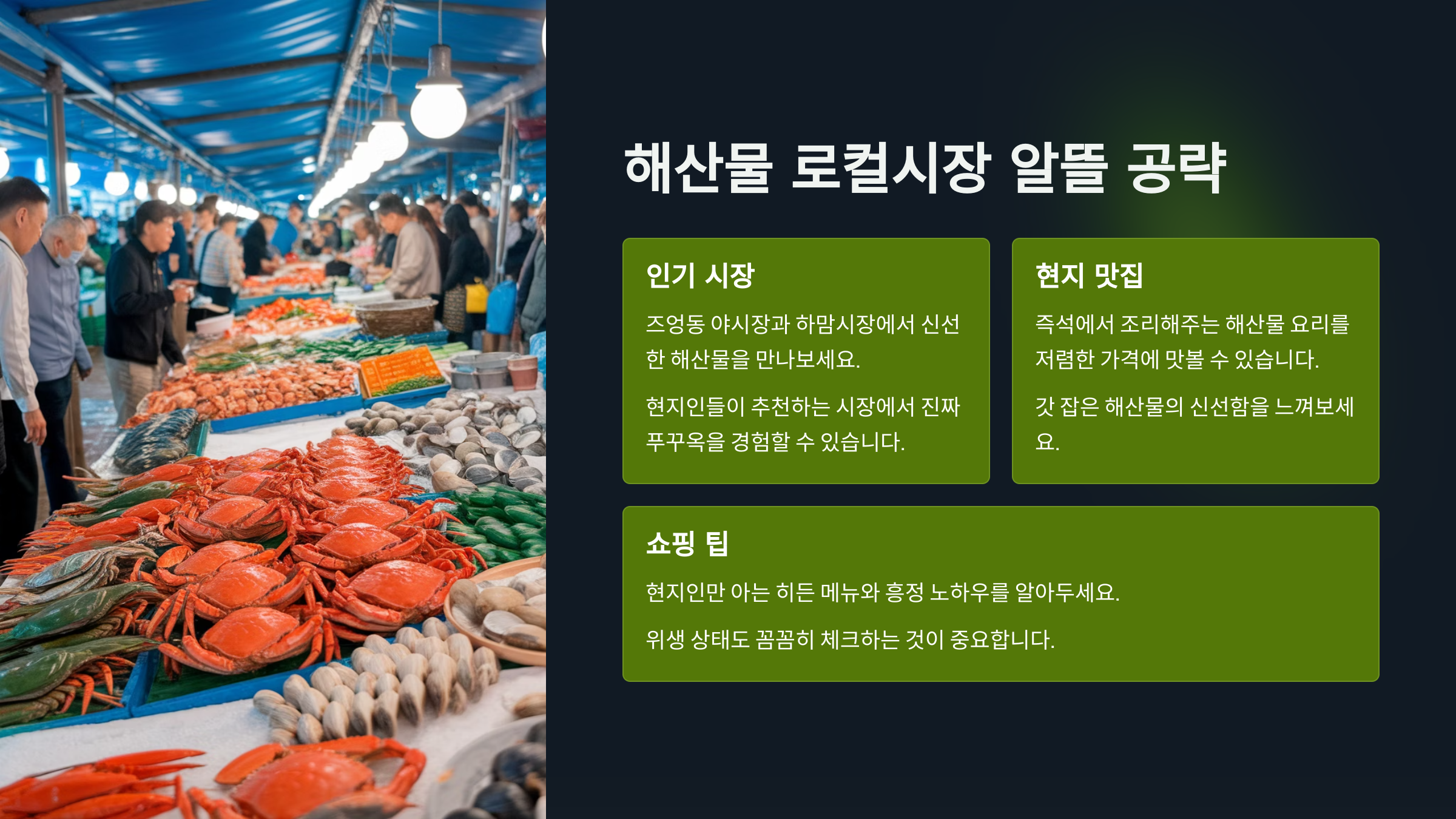 먹거리 외에도 말린 해산물, 건어물, 젓갈 같은 현지 특산품도 인기 만점이에요. 선물용으로도 딱 좋고, 가격 대비 품질이 좋아서 현지인 추천템으로 손꼽힌답니다.