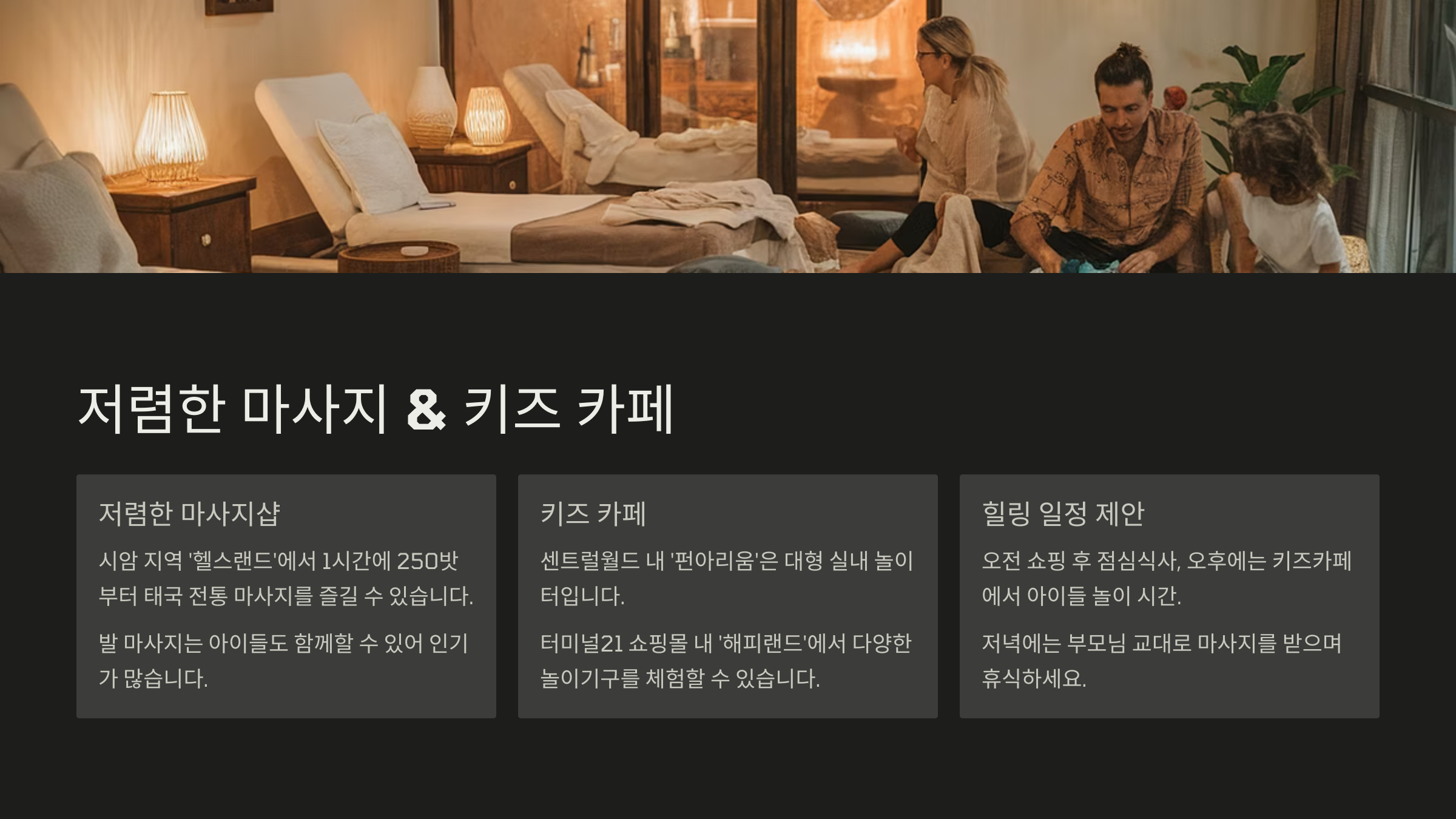 마사지와 키즈카페를 함께 즐기면 하루 일정 중 한두 시간은 평화롭게 쉴 수 있어서 좋고, 아이들도 지루하지 않아요. 서로에게 배려하며 휴식 시간을 만들어보세요!