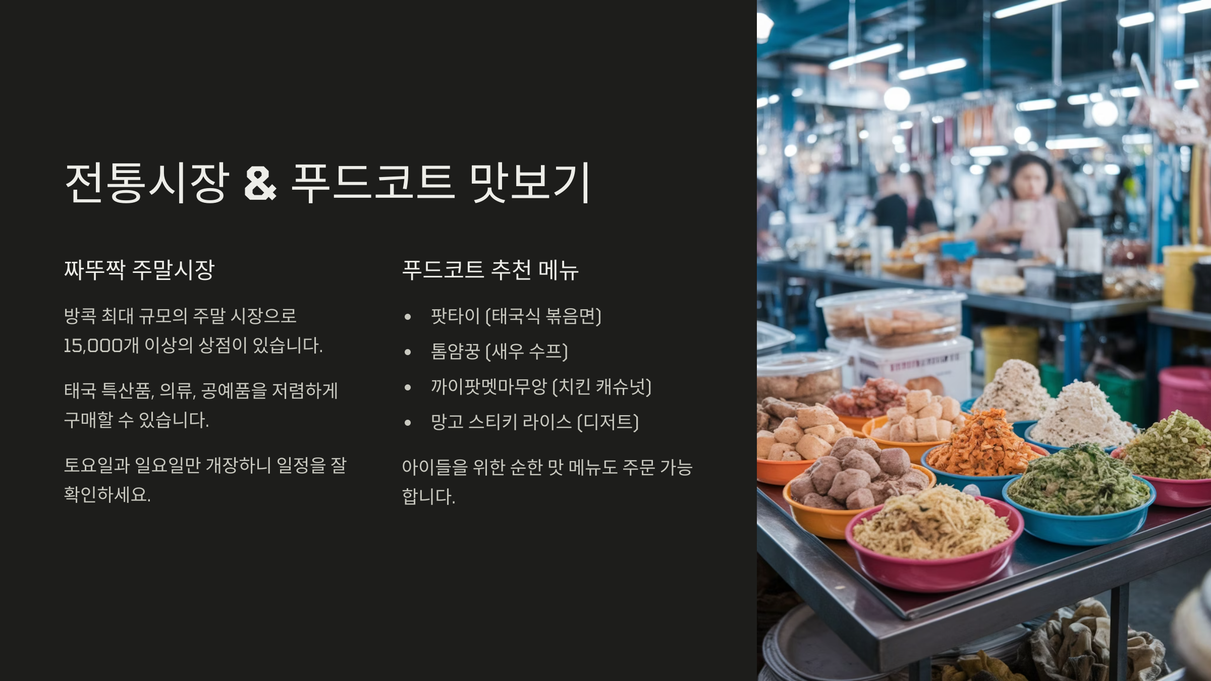 태국 여행에서 빠질 수 없는 재미 중 하나는 바로 '먹방 여행'이에요! 특히 가족 단위 여행자라면 위생 걱정 없는 푸드코트와 전통시장을 조합해서 다녀보는 게 좋아요. 😋