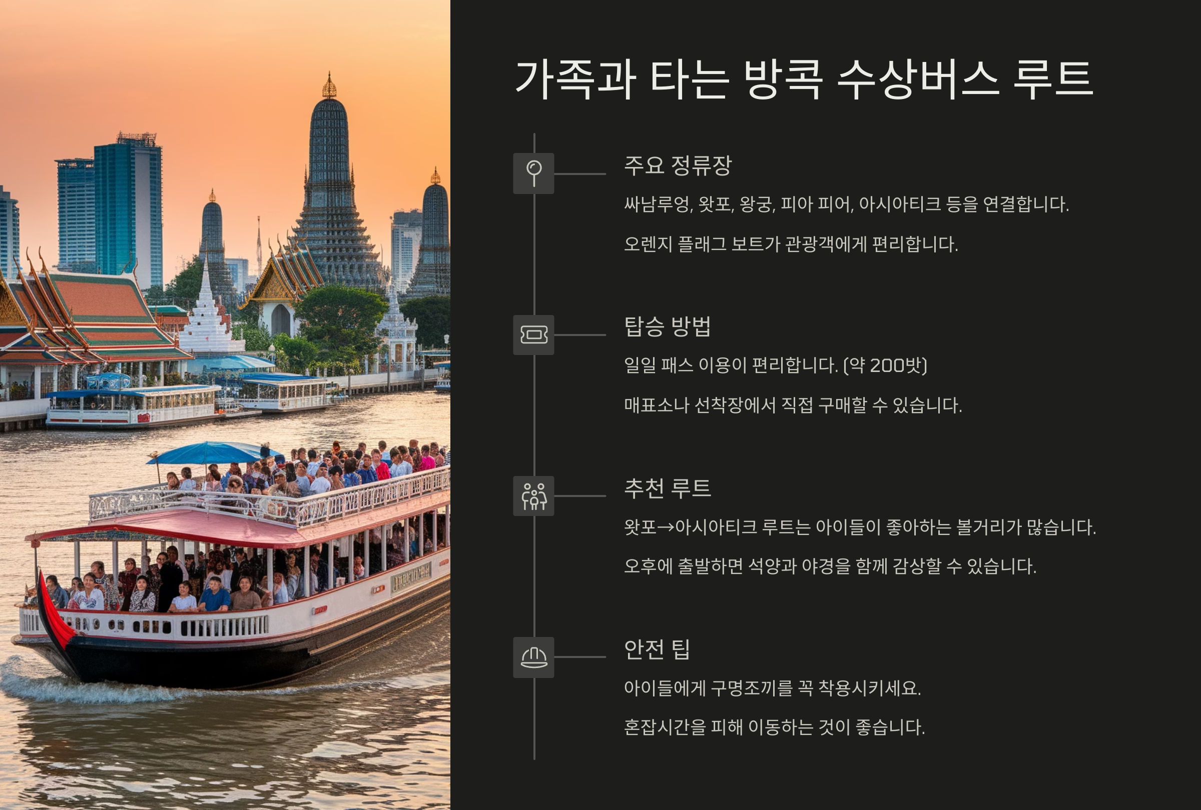 수상버스를 이용한 여행은 도심의 혼잡함을 벗어나 여유롭게 관광지를 순회할 수 있는 가장 멋진 방법 중 하나예요. 방콕의 낭만을 강 위에서 느껴보세요. 😌