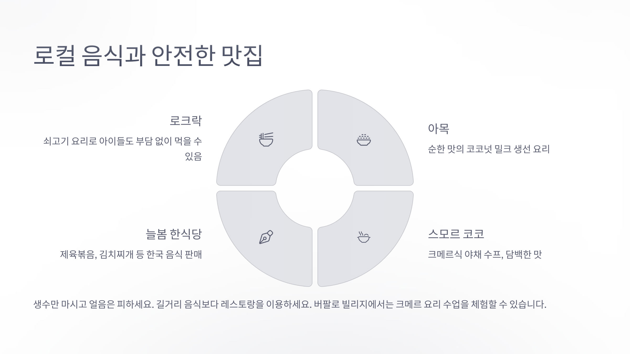 또한 물은 반드시 생수만 마시고, 얼음도 가급적 정제된 곳에서 제공된 것인지 확인하는 게 좋아요. 안전한 식사를 통해 여행의 컨디션을 유지하는 게 가장 중요하답니다 💧