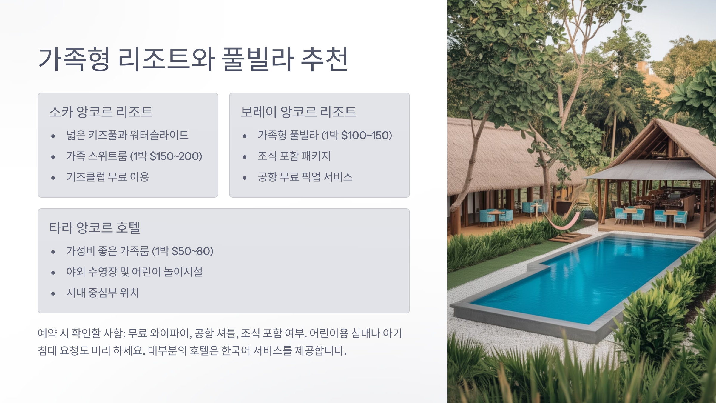 씨엠립에는 고급 리조트부터 가성비 풀빌라까지 다양한 옵션이 있어요. 요즘엔 프라이빗한 휴식을 원하는 가족들을 위해 풀빌라 예약도 많이 하더라고요. 가족만의 공간에서 조용하고 여유롭게 쉴 수 있어서 정말 좋아요!