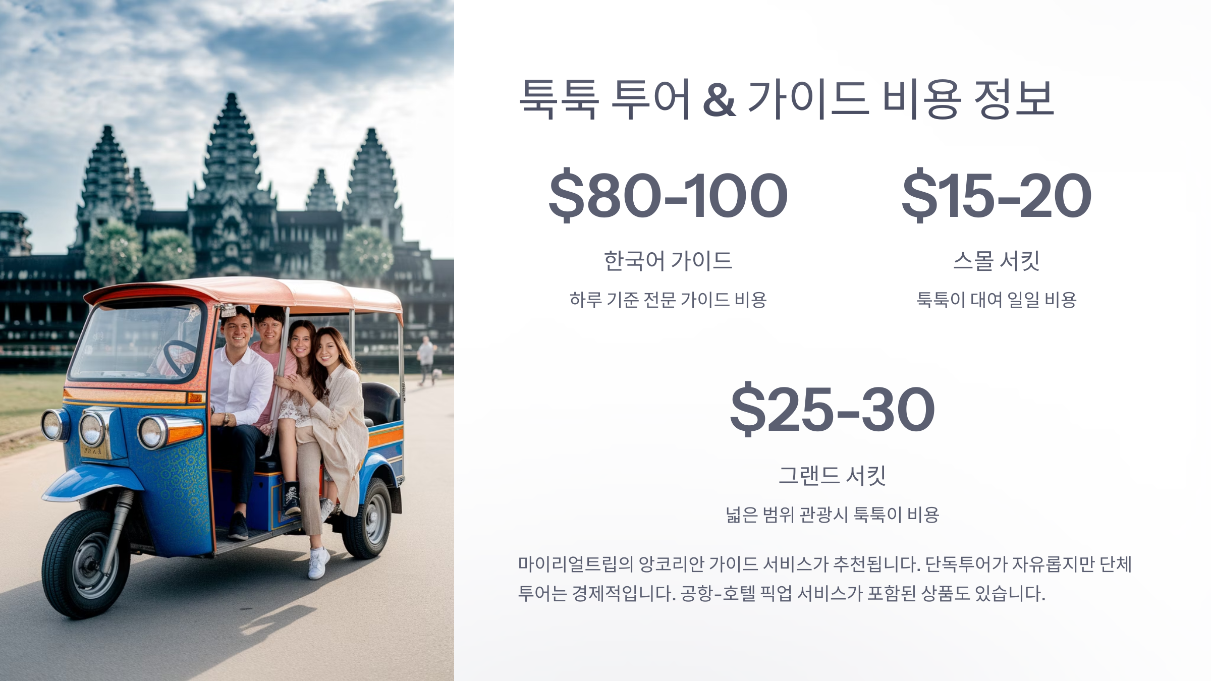 이제 다음은 이동과 관련된 툭툭 투어와 가이드 비용 정보로 넘어가볼게요!