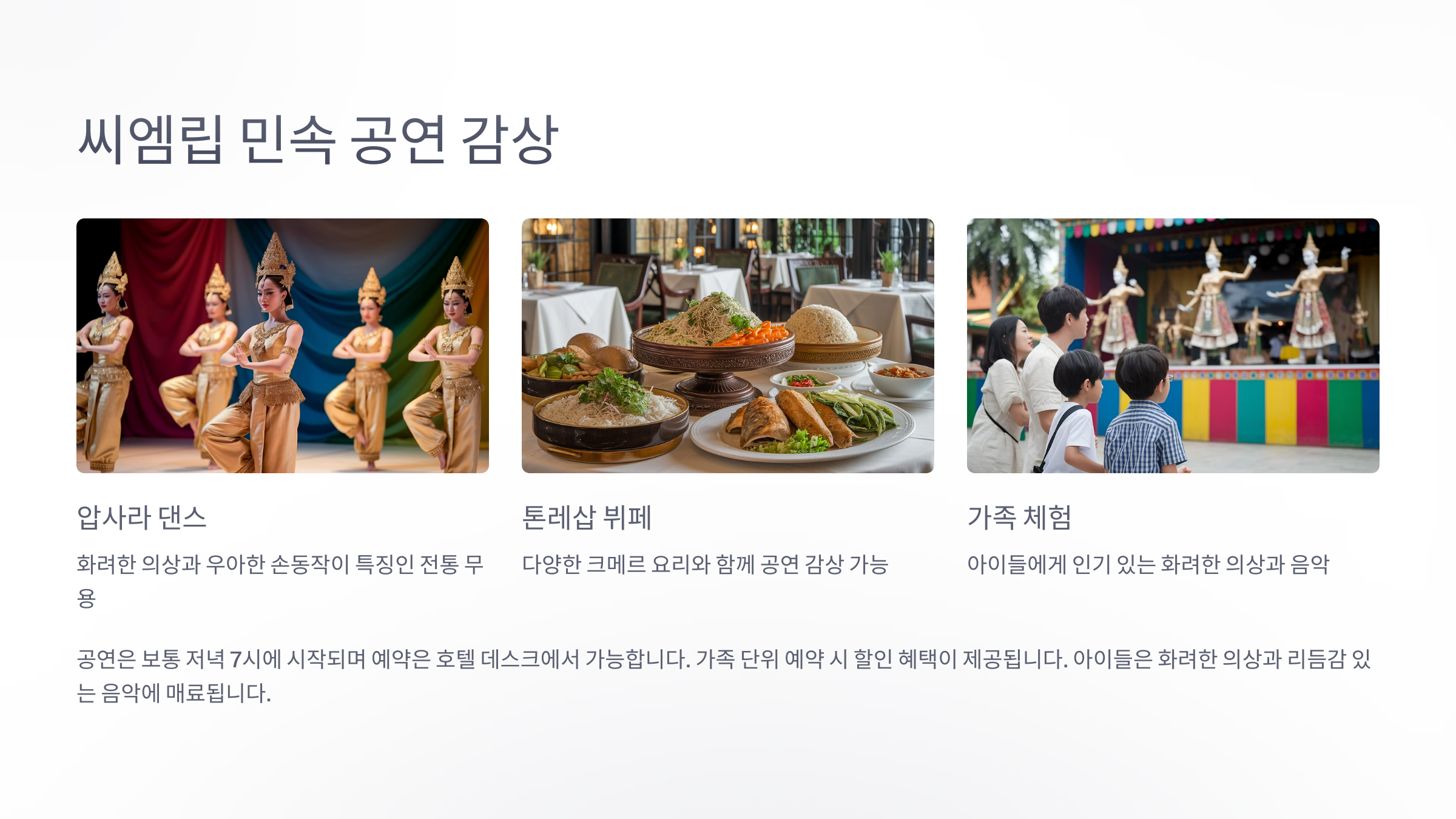 씨엠립의 밤을 특별하게 채워주는 건 바로 전통 민속 공연이에요! 하루 종일 유적지를 둘러보고 난 뒤 가족과 함께 문화 공연을 감상하는 건 여행의 여운을 깊게 해주는 최고의 마무리예요.