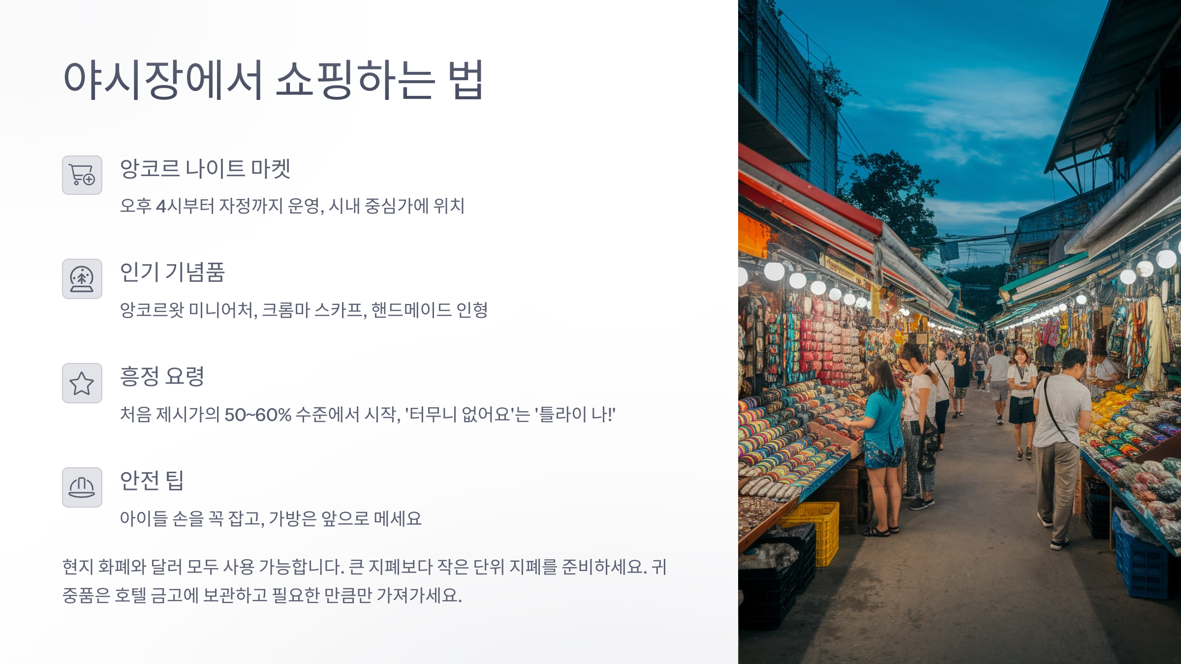 시엠립의 야시장은 단순한 쇼핑 공간이 아니에요. 현지 문화를 느끼고, 사람들과 어울리며, 감성을 충전할 수 있는 공간이죠. 밤이 되면 반짝이는 불빛 속에 사람들의 웃음과 흥정 소리가 가득해요 ✨