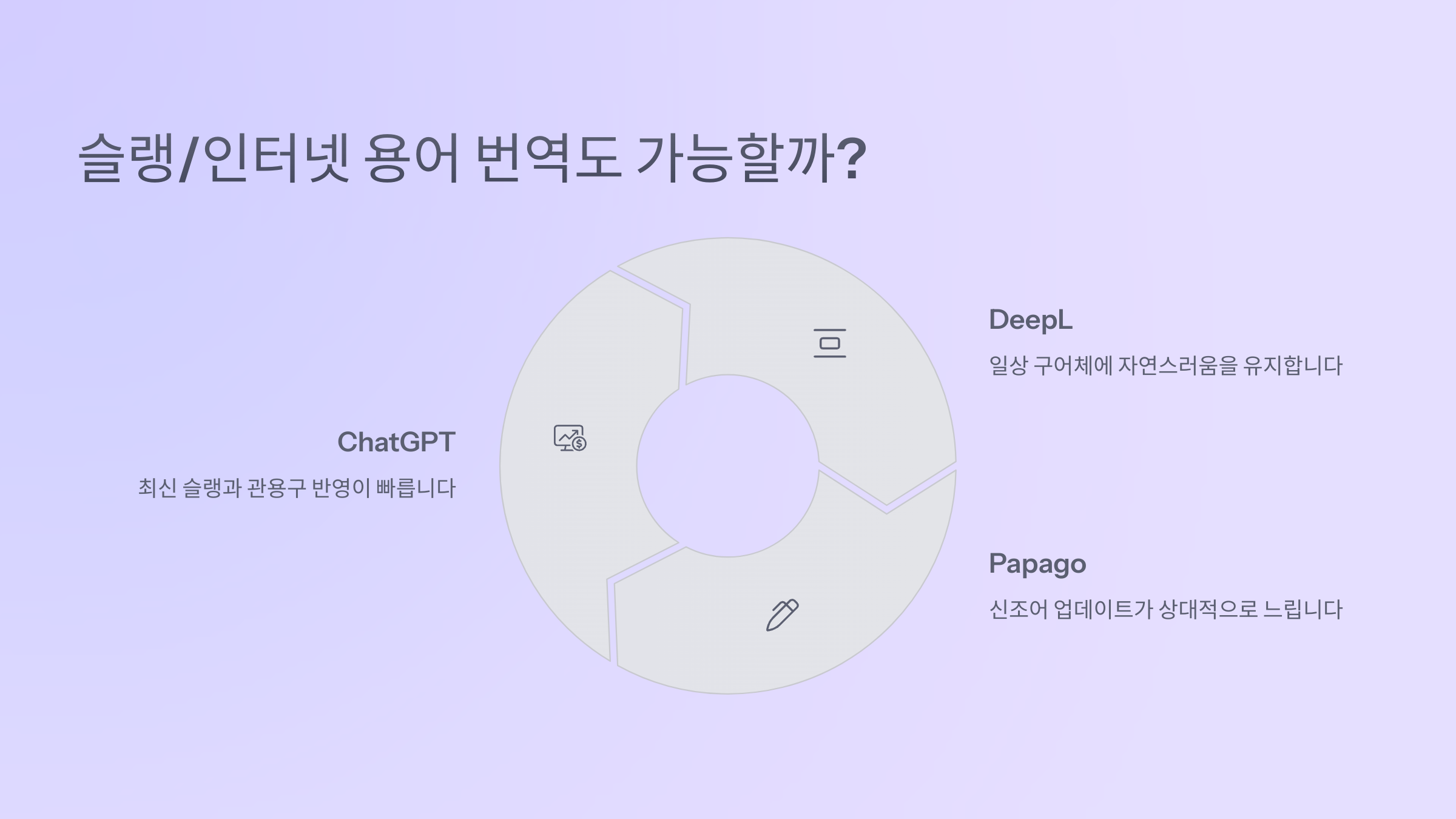 DeepL도 슬랭 번역은 가능하지만, 유럽권 언어 슬랭에 더 강점을 보이는 것 같아요. 내가 생각했을 때 ChatGPT가 슬랭 처리에서는 한발 앞선 느낌이에요! 😎