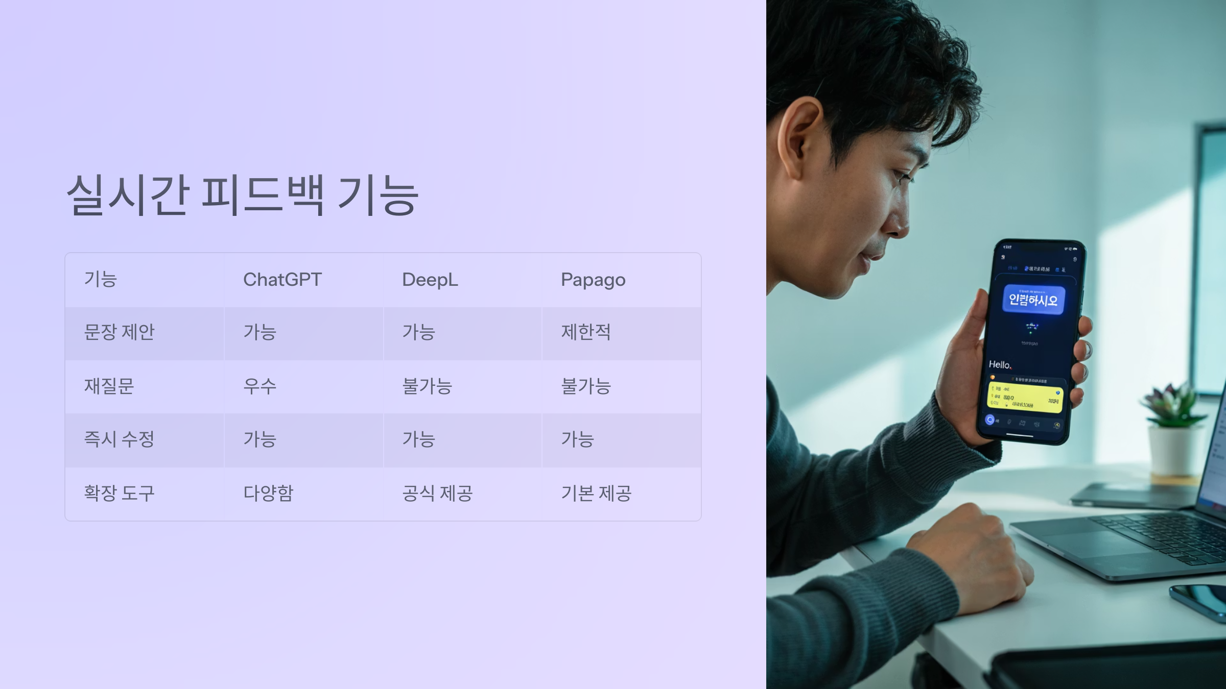 AI 번역 앱이 점점 똑똑해지면서, 실시간으로 피드백을 주는 기능도 생겼어요. 문장을 입력하면, "이 표현은 더 자연스럽게 이렇게 바꿀 수 있어요"라고 제안해주죠.