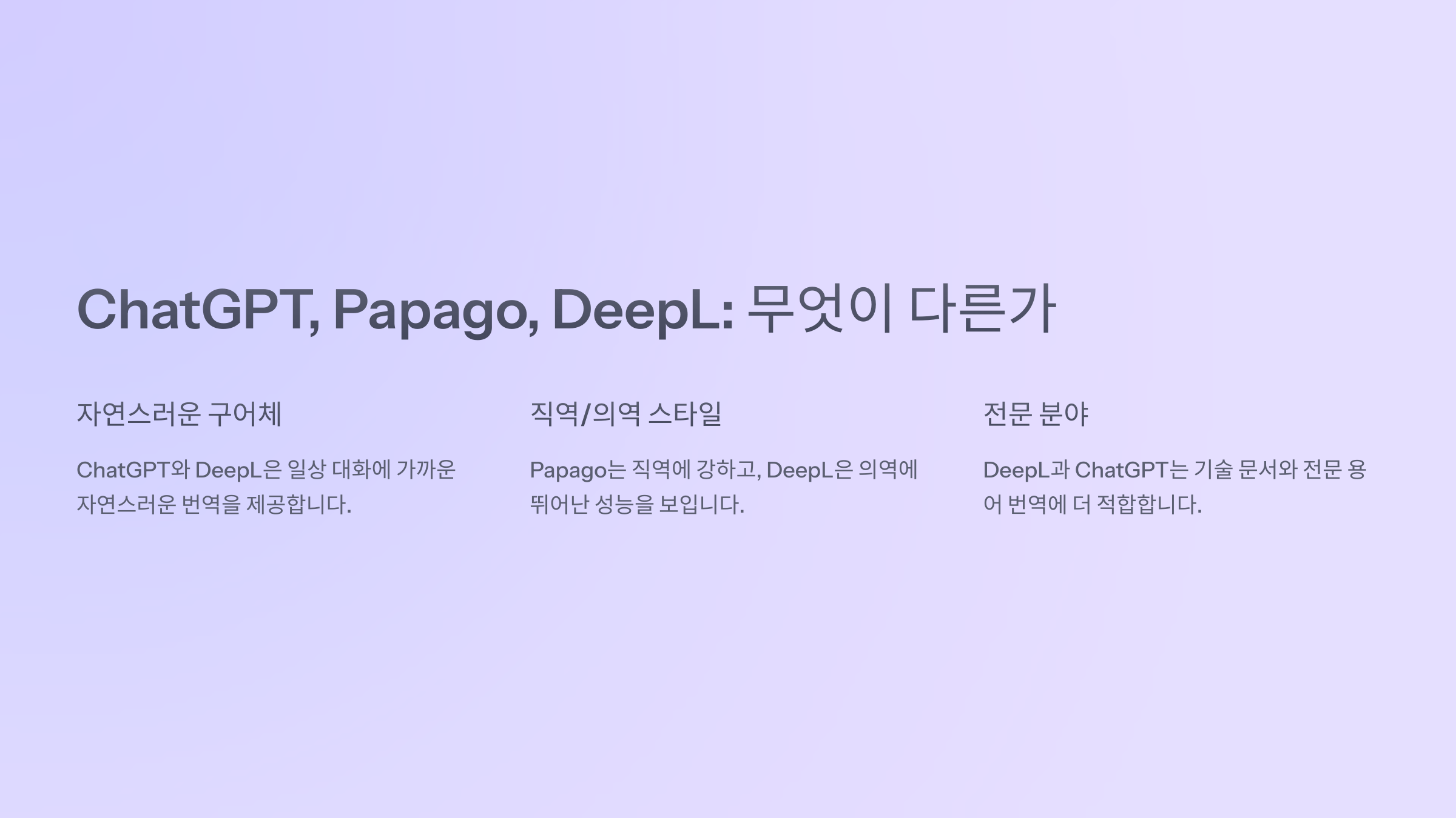 세 가지 AI 번역 앱은 각자 강점이 달라요. ChatGPT는 자유로운 문장 생성이 강점이고, Papago는 한국어 기반 문맥 이해에 탁월하며, DeepL은 문장 뉘앙스를 섬세하게 살리는 게 특기예요.