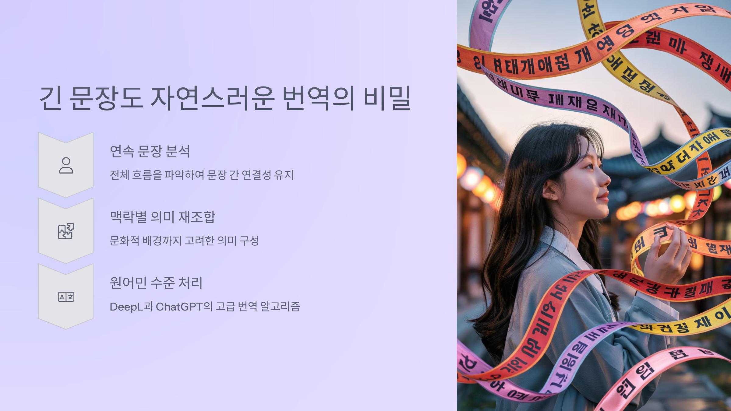 특히 ChatGPT나 DeepL 같은 최신 모델은 '전체 흐름'을 보고 번역을 해요. 그래서 끊기지 않고 부드럽게 이어지는 문장이 탄생하는 거랍니다. 정말 감탄스러워요! 😍