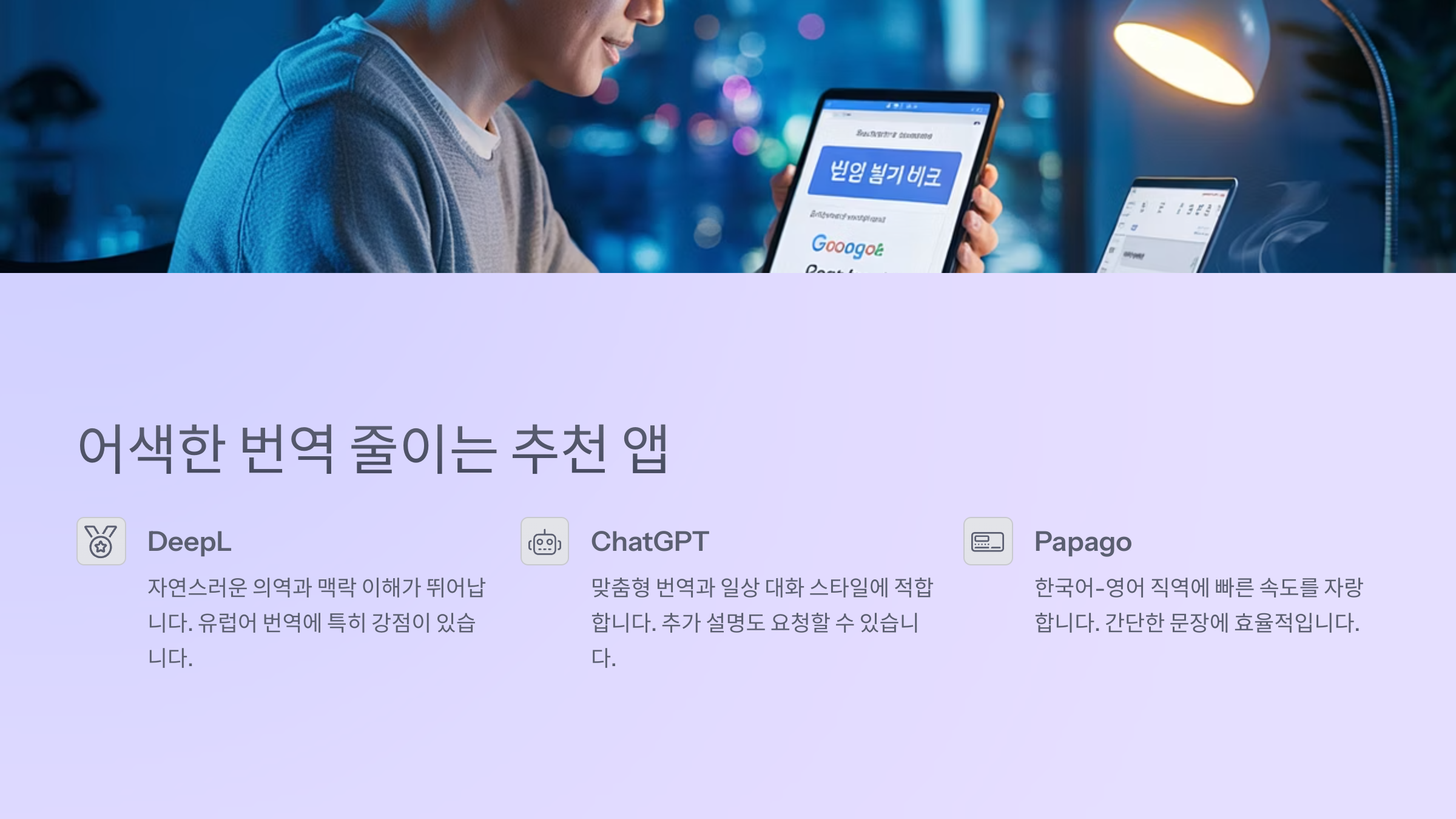 어색한 번역을 피하려면, 앱을 고를 때 "학습 데이터가 풍부하고 최신 업데이트가 꾸준한지" 꼭 확인해야 해요! 👀