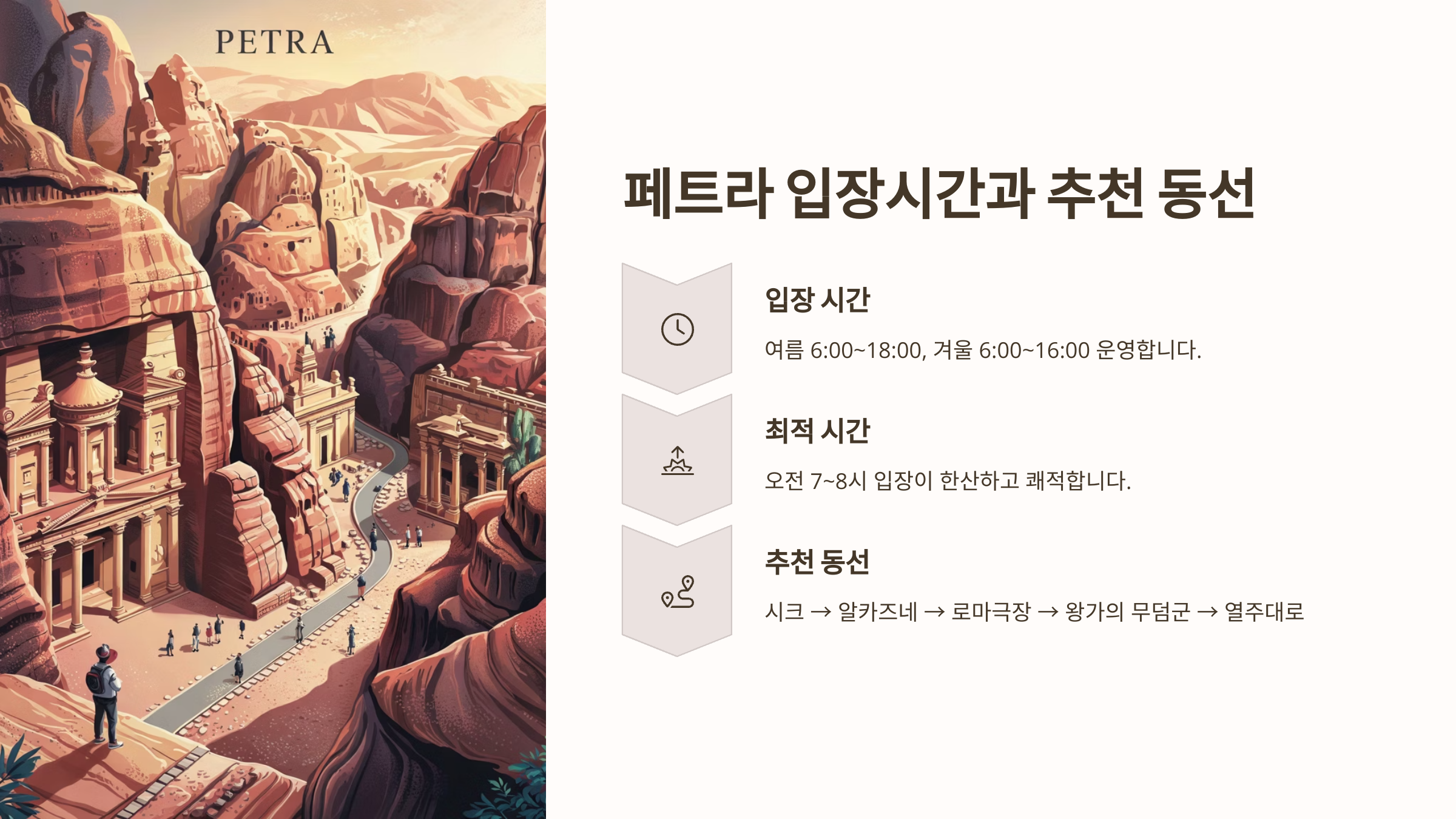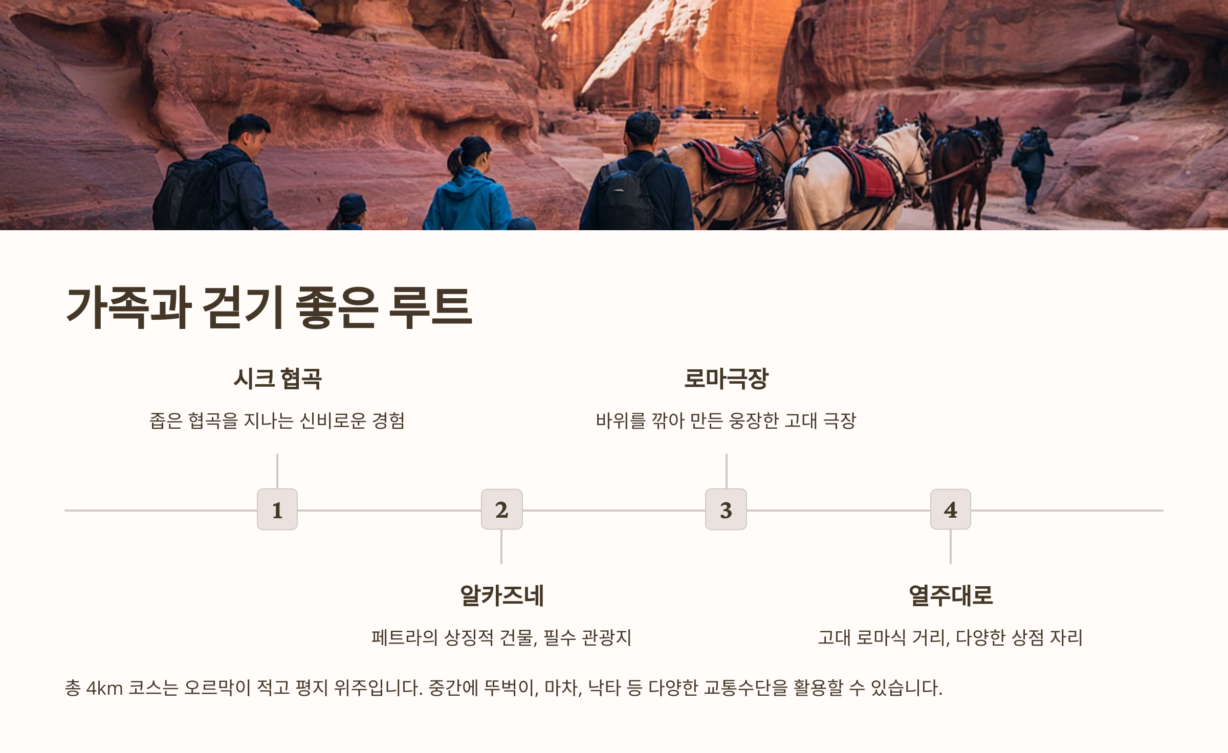 페트라는 돌길이 많고 오르막도 있어서 아이와 함께라면 전체 동선을 모두 소화하기엔 무리일 수 있어요. 그렇다고 걱정할 필요는 없어요! 체력 부담을 줄이면서도 아름다운 페트라를 충분히 감상할 수 있는 루트를 소개할게요.👣