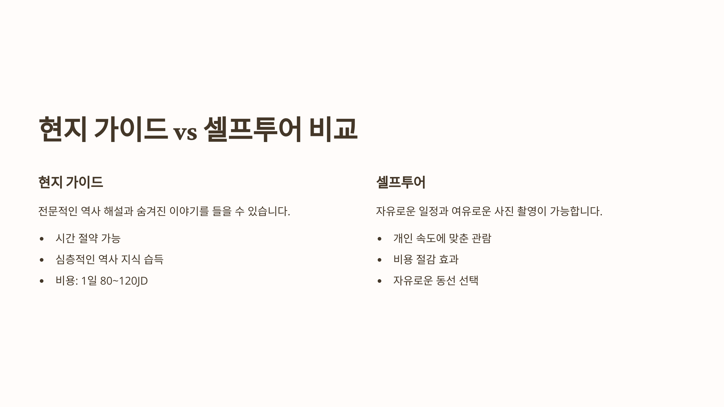 | 비용 | 약 50~70JD | 0JD (자유탐방) |