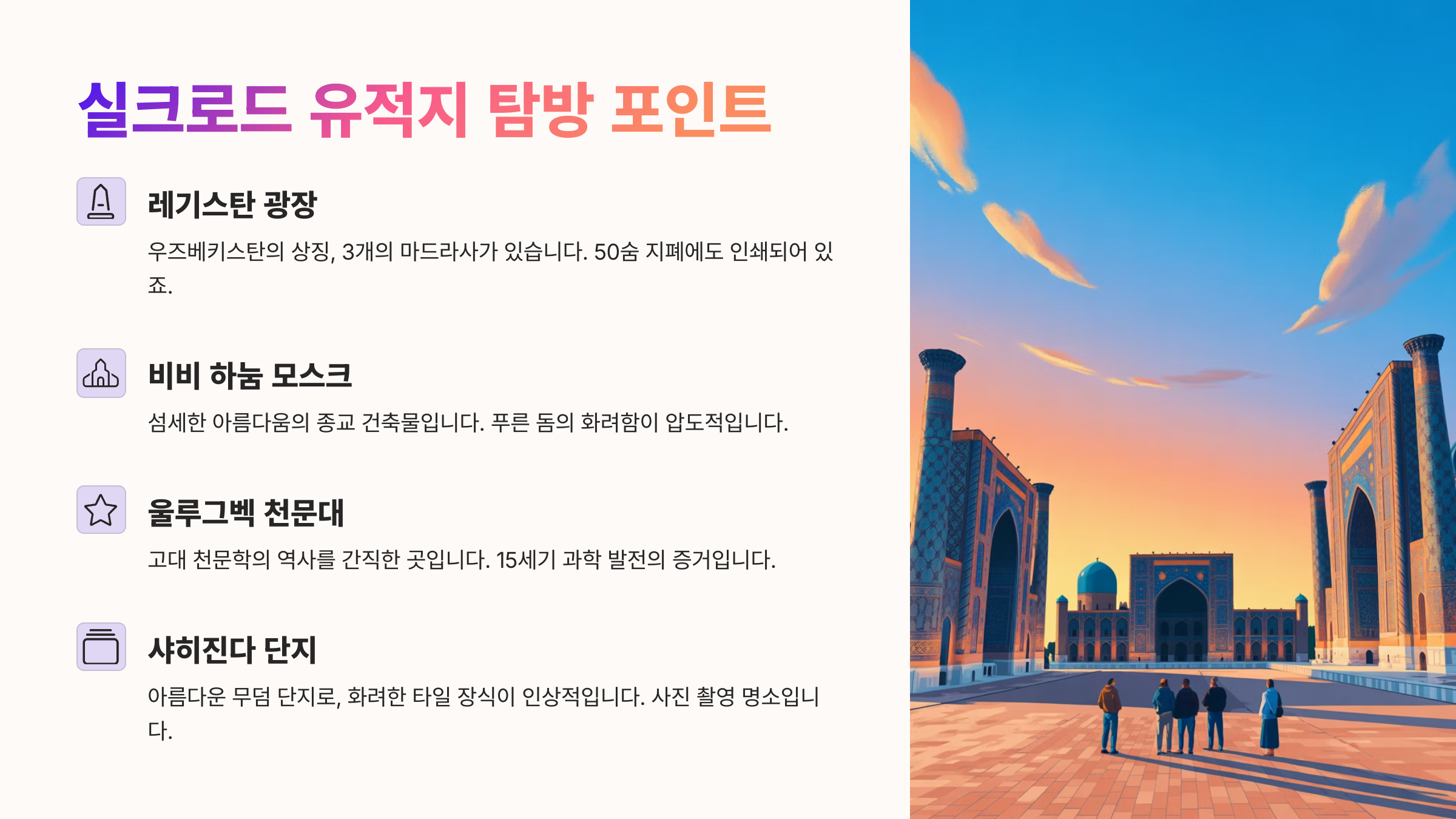 👇 다음 섹션은 유적지 탐방 포인트예요. 실크로드의 진수를 만나보세요!
