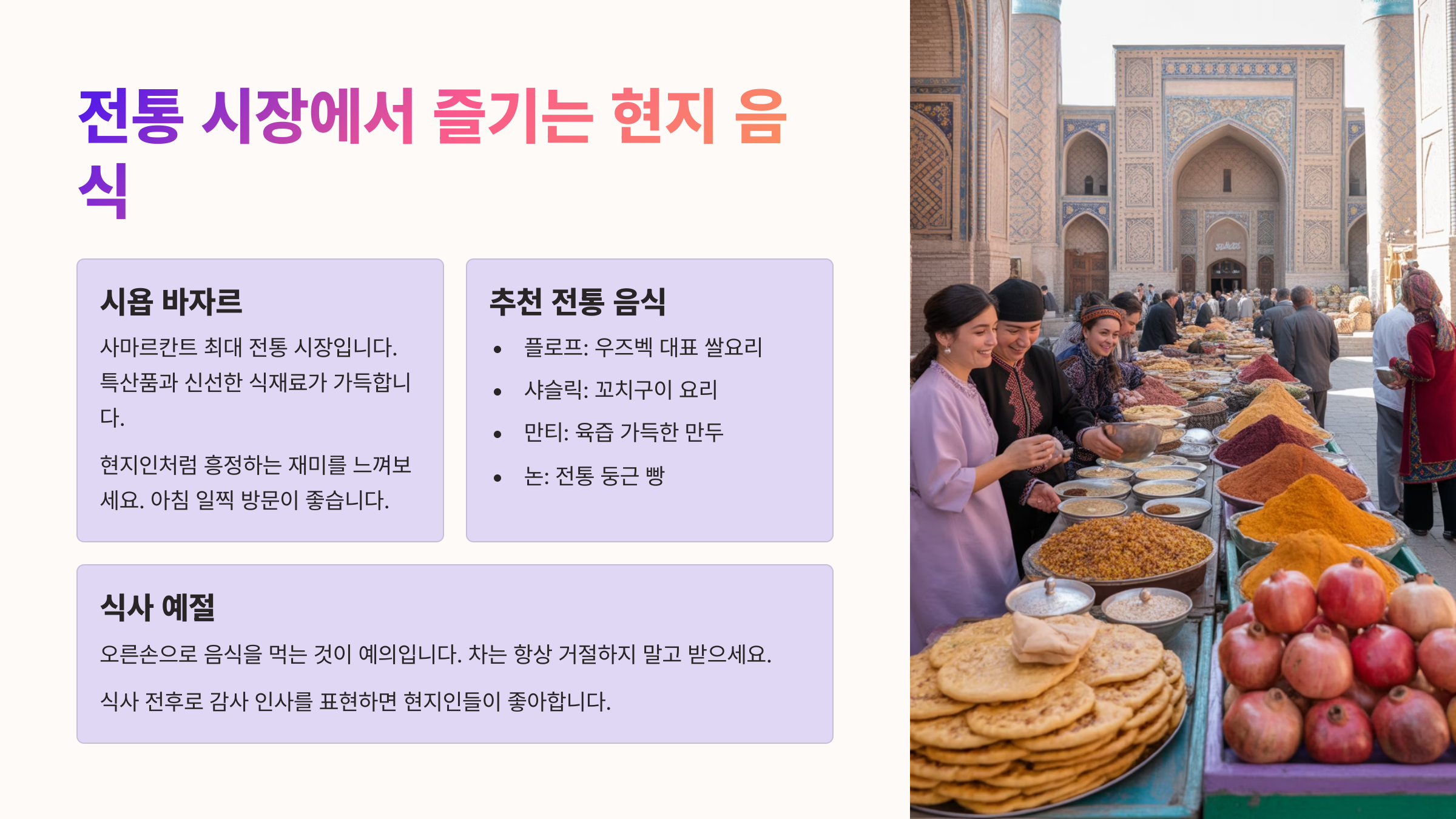 세 번째는 의외로 의사소통이에요. 영어 사용이 제한적인 경우가 많아, 러시아어나 우즈벡어 인사말 몇 개 정도는 외워두면 현지인들과의 소통이 훨씬 수월해져요. 웃으면서 손짓하는 것도 큰 도움이 되죠 😊