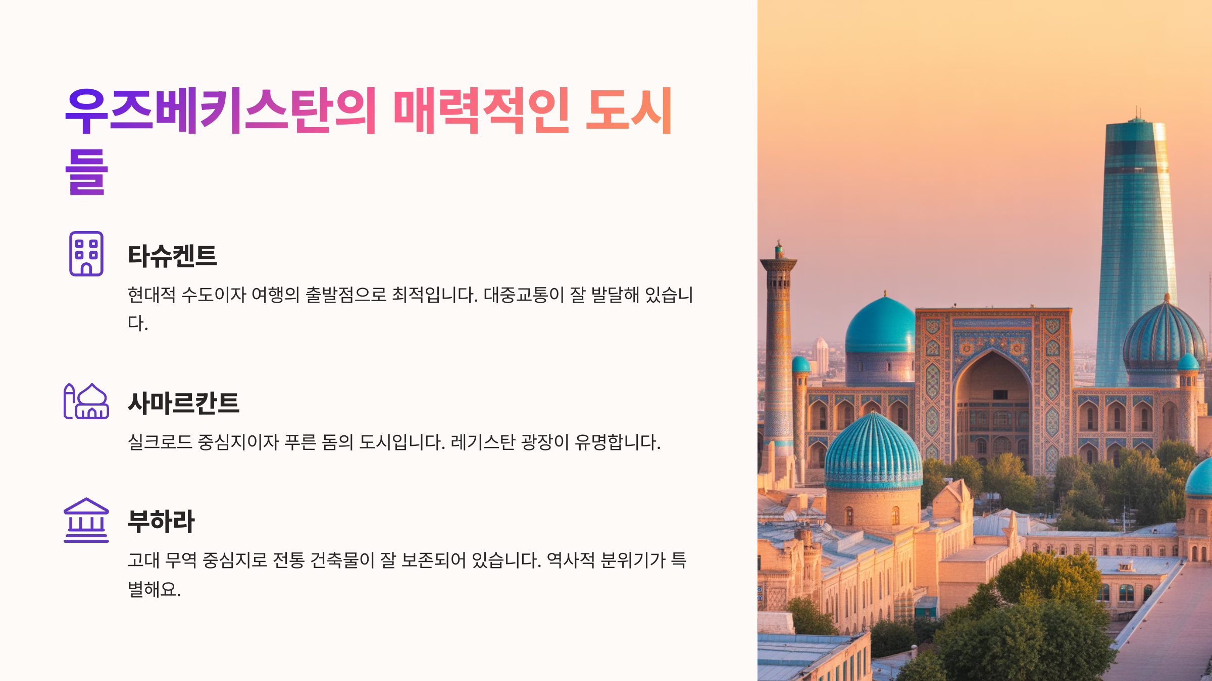 🏙️ 우즈베키스탄의 매력적인 도시들