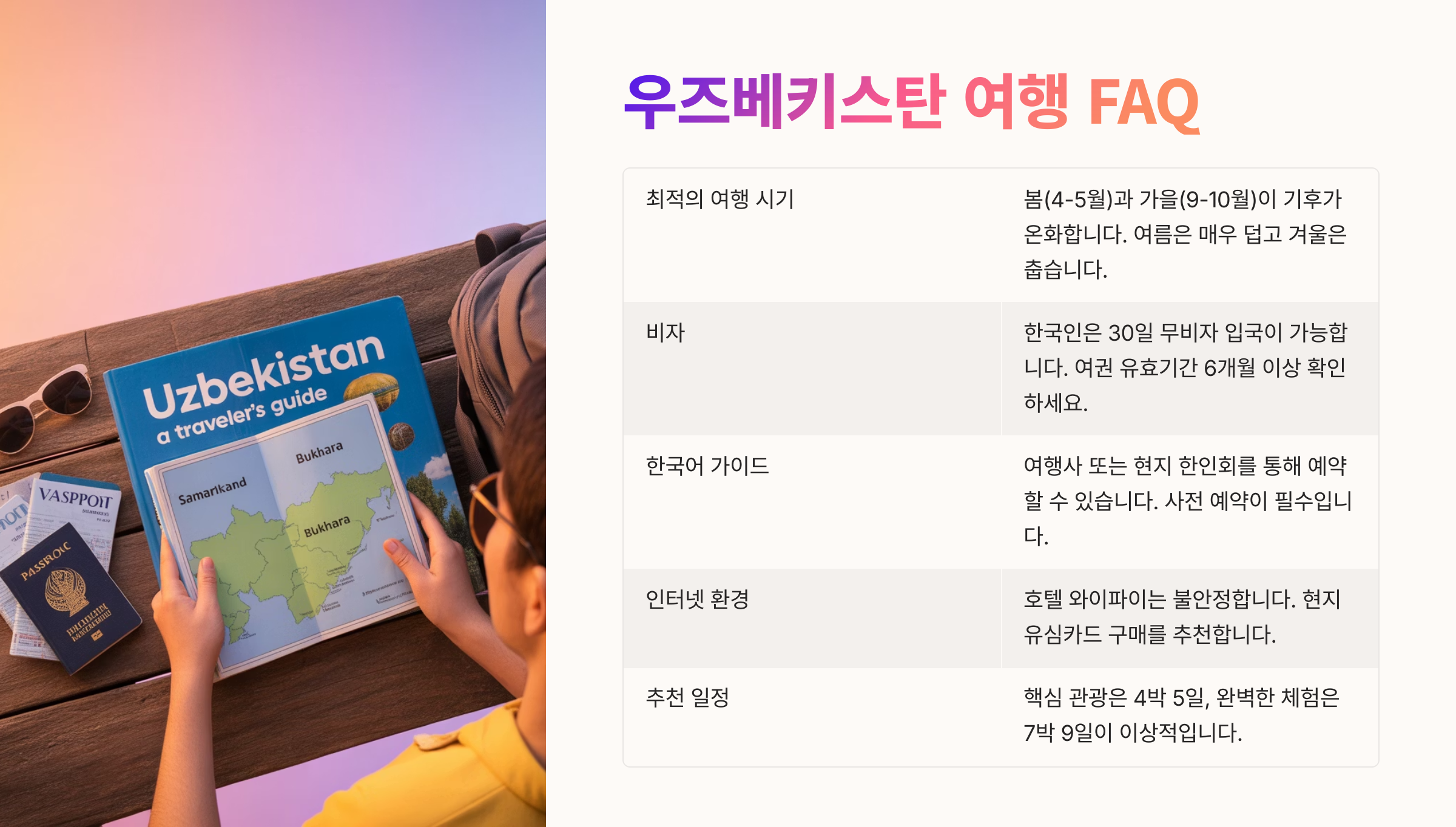첫 번째는 비자와 입국 관련 실수예요. 현재 한국인은 우즈베키스탄 30일 무비자 입국이 가능하지만, 여권 유효기간이 6개월 이상 남아 있어야 하고, 출국 티켓도 확인하는 경우가 많아요.